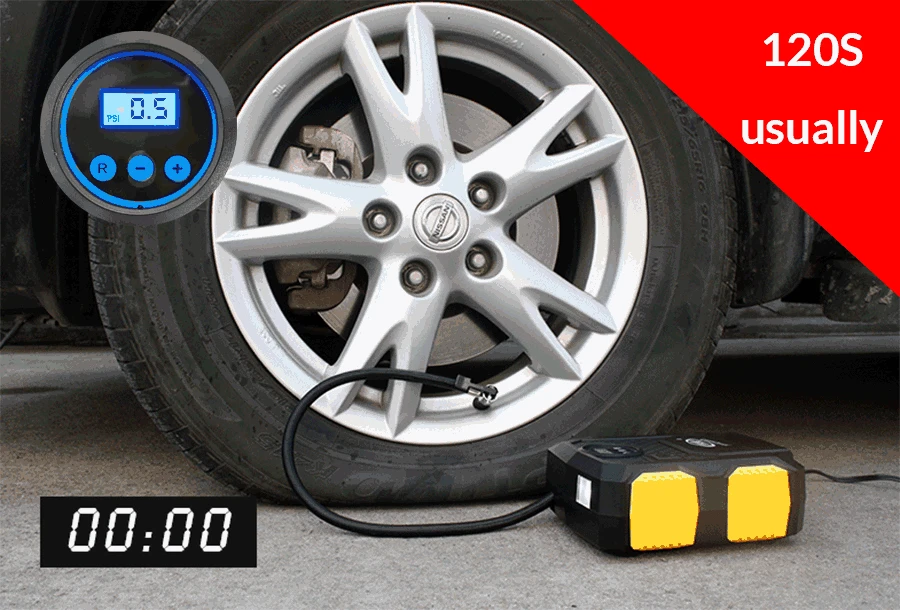 Сильный поток 35Л/мин, позволяет надувать стандартную среднюю автомобильную шину от 0 ~ 36PSI (0-248KPA) всего за 4-6 минут.
