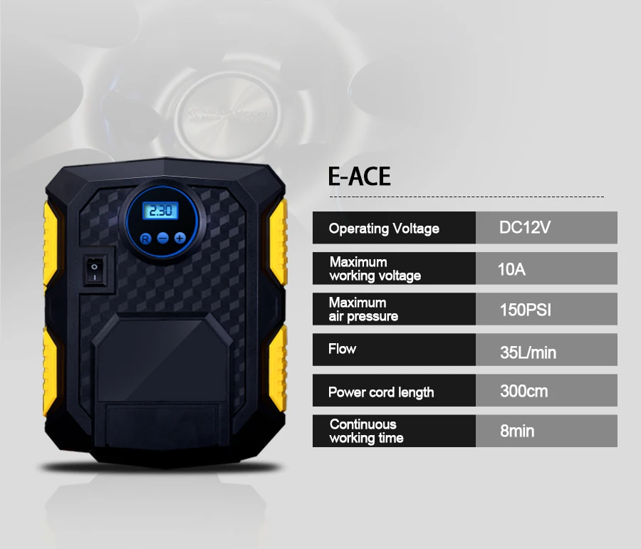 Материал: корпус из АБС-пластика с медным мотором Входная мощность: 12 В постоянного тока Полный ток нагрузки: 10A Мощность: 120 Вт Максимальное давление: 150psi Поток: Infact 35Л/мин (коробка для записи 27Л) Манометр: PSI, BAR, KPA, KGF/CM2 Непрерывное время работы: 8 минут Рабочая температура: 20-60 ℃ Длина кабеля питания: прибл. 3 м/9,8 футов Длина шланга: прибл. 50 см/19,6" Размер изделия: 20*16*8 см (Д * Ш * В) Вес нетто: 0,88 кг/19,3 унций