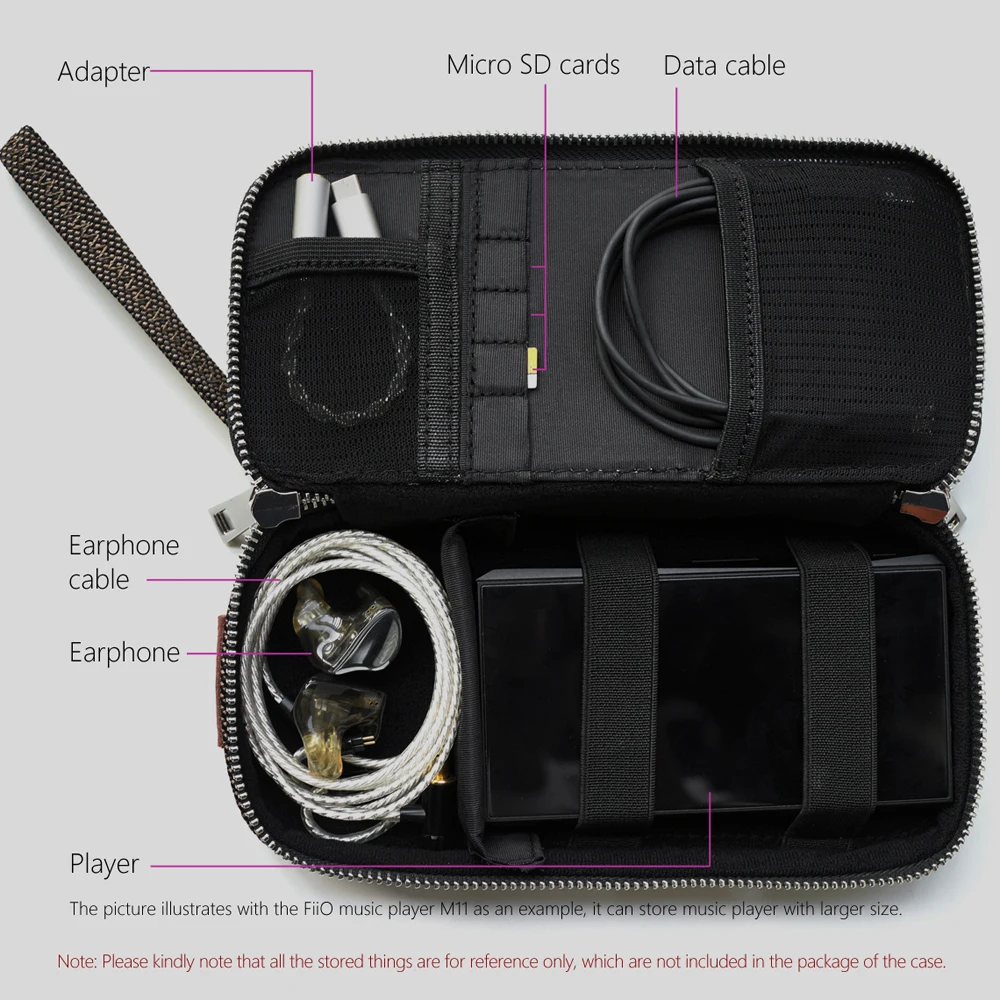 Сумка позволяет хранить музыкальный плеер, наушники, кабели для наушников, карты micro SD, кабели для передачи данных и адаптеры одновременно, не создавая беспорядка