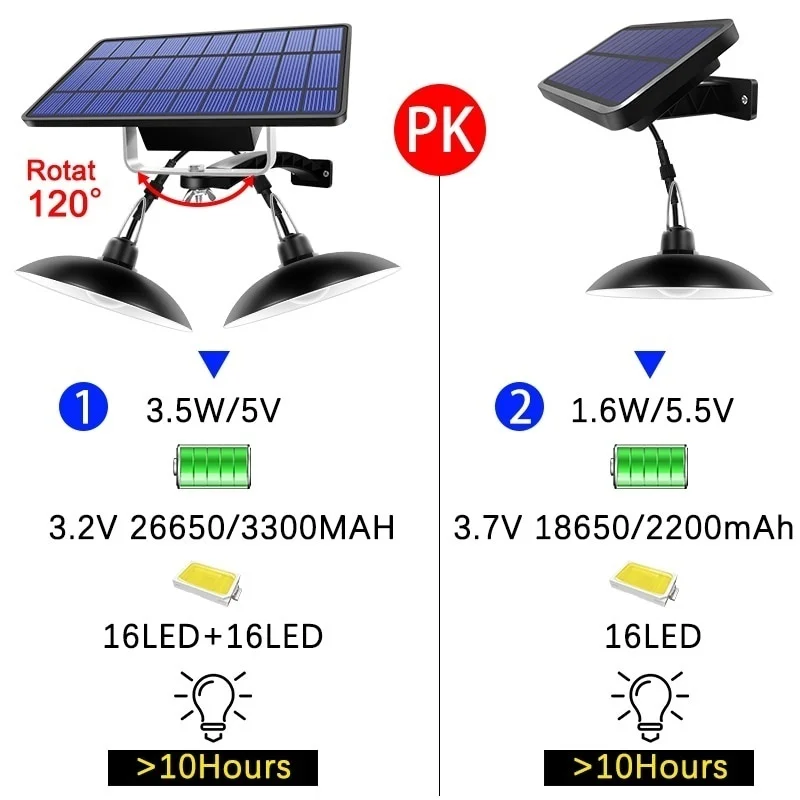 Спецификация одиночной головки: Солнечная панель: 1,6 Вт 5,5 В Светодиоды: 16 шт. Светодиодный светильник; Цвет: теплый белый/белый Батарея: 18650 литиевая батарея 3,7 В 2200 мАч Водонепроницаемость: IP65 Материал абажура: поликарбонат Материал корпуса: PC + ABS Скорость выхода: 1,5 Вт Люмен: 260 лм Режим работы: автоматически включается светильник в ночное время до выключения питания Спецификация двойной головки: Солнечная панель: 3,5 Вт 5 В Светодиоды: 16 шт. + 16 шт. Светодиодный светильник; Цвет: теплый белый/белый Батарея: 18650 литиевая батарея 3,2 V 3300mah Водонепроницаемость: IP65 Материал абажура: поликарбонат Материал корпуса: PC + ABS Люмены: 260 лм каждая лампа Режим работы: автоматически включается светильник в ночное время до выключения питания