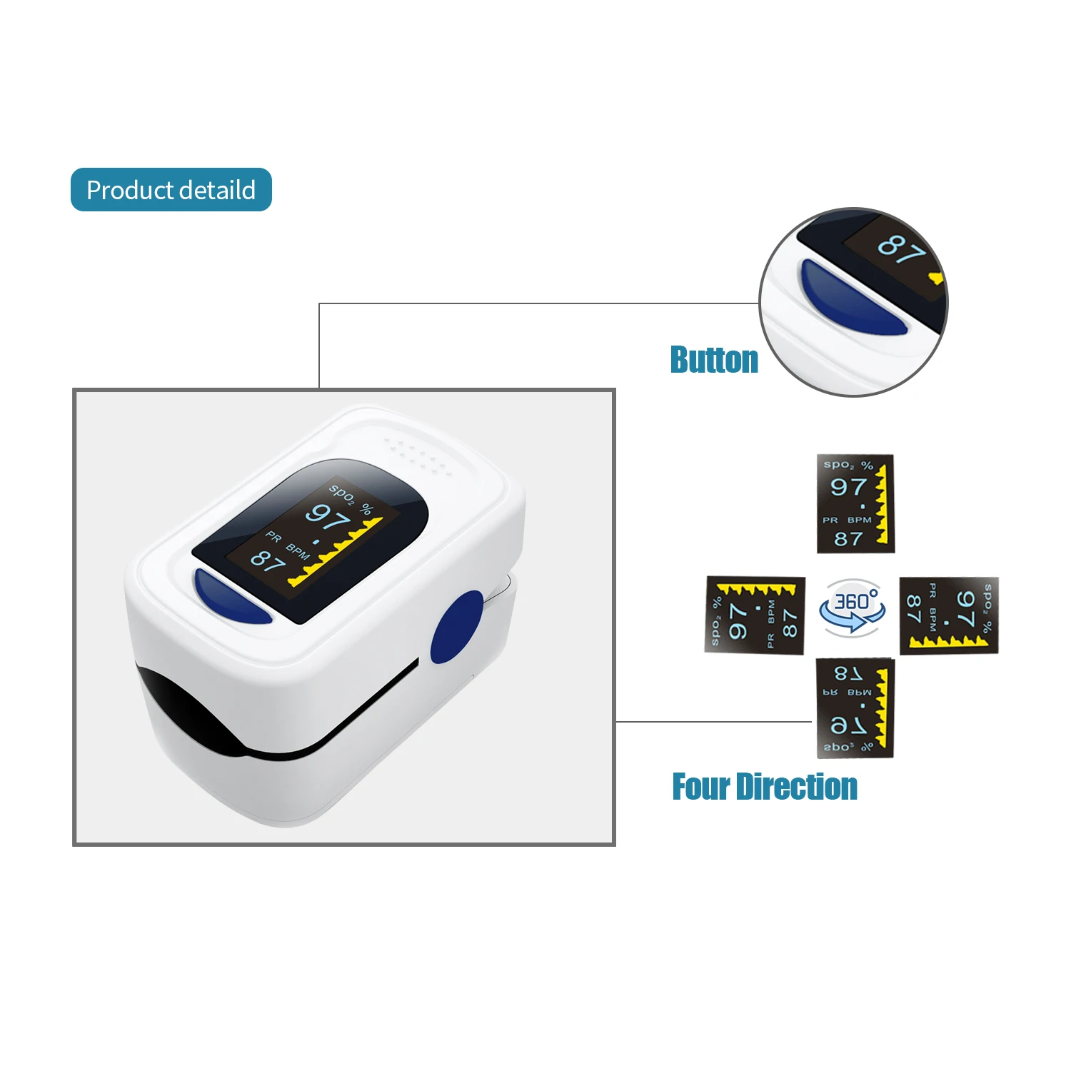 Пульсоксиметр с кончиком пальца-это доступный способ точно измерить пульс (PR), уровень насыщения кислородом в крови (SpO2) и индекс перфузии (PI). С oled-дисплеем, он может четко показать данные тестирования. Управление одной кнопкой, простота в использовании. Широко используется в семейных, больничных, кислородных, социальных организаций medi-cal, физической помощи в спорте и т. Д.