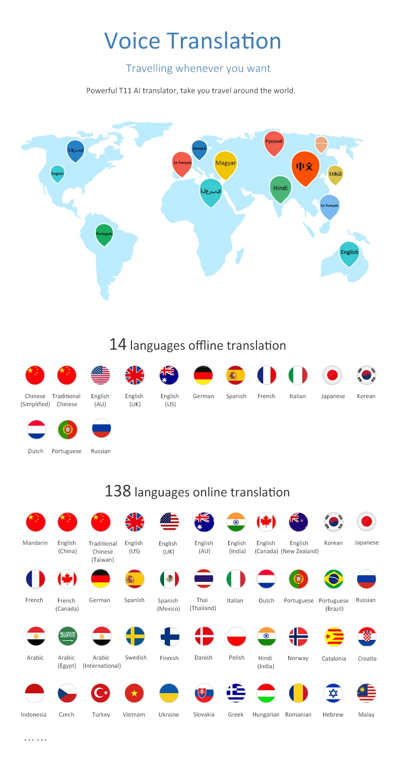 Система T11 продолжит обновление и итерацию. Если есть новая система, которая должна быть обновлена, она поддерживает фоновое нажатие, и пользователи могут выбрать автоматическое обновление онлайн. Используя передовые технологические достижения, позвольте клиентам испытать последний и самый полный опыт перевода Поддержка онлайн офлайн голосового перевода и камеры Фото перевода Поддержка WIFI и hotpot Громкий динамик и двойной микрофон, встроенный внутри, уменьшает шум, делая голос более громким и четким 138 языков онлайн перевод: упрощенный китайский, традиционный китайский, американский английский, британский английский, австралийский английский, индийский английский, канадский английский, новозеландский английский, немецкий, испанский, итальянский, японский, корейский, голландский, португальский, русский, французский, французский Канадский, тайский, арабский, шведский, финский, Датский, польский, хинди, норвежский, каталанский, хорватский, индонезийский, чешский, турецкий, вьетнамский, украинский язык, словацкий, греческий, венгерский, румынский, иврит, малайский... 14 языков офлайн перевод: упрощенный китайский, традиционный китайский, американский английский, британский английский, австралийский английский, немецкий, испанский, итальянский, японский, корейский, голландский, португальский, русский 11 поддерживаемых языков системы: Китайский традиционный китайский английский Итальянский Немецкий французский индийский Арабский Тайский Русский Японский