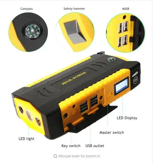 1. Полицейский синий светильник 2. Светодиодный светильник 3. Полицейская красная вспышка светильник Выход 4,15 В/16 В/19 в 5. Переключатель на светильник 6,4 выход USB 7,12 V/15V/1A Вход 8. Главный выключатель 9. Светодиодный дисплей 10. Порт запуска автомобиля 11. Аварийный молоток 12. Компас 13. Резак ремня безопасности