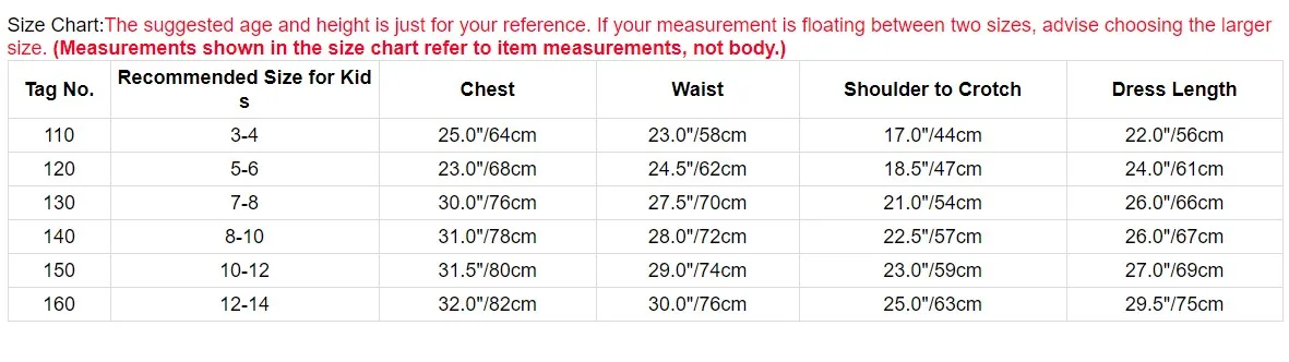 Номер бирки Рекомендуемый размер для детей Грудь Талия От плеча до паха Длина платья 110 3-4 25,0 "/64 см 23,0 "/58 см 17,0 "/44 см 22,0 "/56 см 120 5-6 23,0 "/68 см 24,5 "/62 см 18,5 "/47 см 24,0 "/61 см 130 7-8 30,0 "/76 см 27,5 "/70 см 21,0 "/54 см 26,0 "/66 см 140 8-10 31,0 "/78 см 28,0 "/72 см 22,5 "/57 см 26,0 "/67 см 150 10-12 31,5 "/80 см 29,0 "/74 см 23,0 "/59 см 27,0 "/69 см 160 12-14 32,0 "/82 см 30,0 "/76 см 25,0 "/63 см 29,5 "/75 смПолезные советы: Замеры делаются вручную, поэтому учитывайте небольшие погрешности. Цвет на фото может немного отличаться от реального товара из-за особенностей цветопередачи различных мониторов.