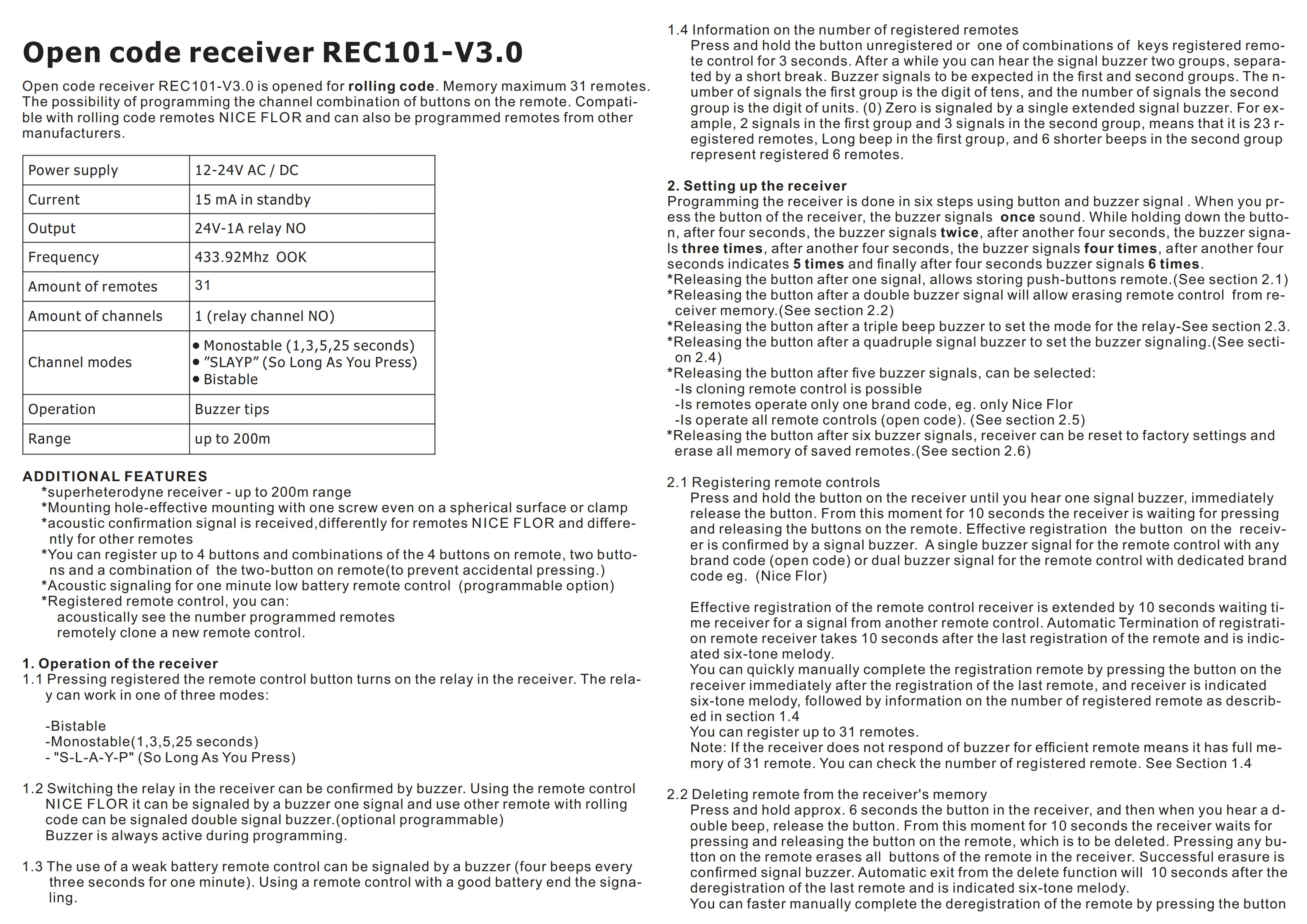 Источник питания: 12-24 В переменного тока/постоянного тока Ток: 15 мА в режиме ожидания Выход: 24V-1A реле нет Частота: 433,92 МГц Количество пультов: 31 Количество каналов: 1 (Релейный канал №) Модели каналов: * моностабильное (1,3,5,25 секунд) * "SLAYP" (при нажатии) * Бистабильный Операция: наконечники зуммера Диапазон: до 200 м