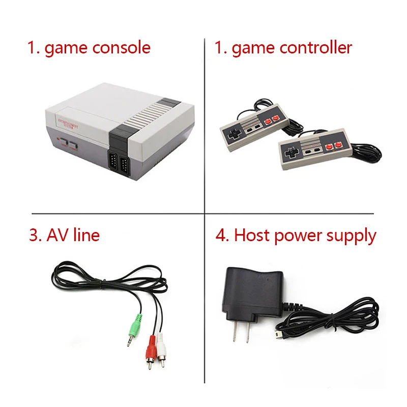 Мини-8-битный Ретро Видео игровой консоли собран в 620 футболки с принтами на тему классических игр, который может поддерживать двух игроков игры! Это игровая консоль, которая поддерживает выход AV. Если вы хотите играть в классические игры с друзьями и семьей, выберите это! Может удовлетворить ваши требования! Характеристика: Классическая игровая машина. Две игровые ручки, чтобы играть с семьей и друзьями. Есть 620 классических игр для вас. Эта игровая консоль с av-выходом для новых классических игровых консолей. Это 8-битный игровой консоли с прост в управлении. Многие классические игры по-прежнему веселые и очень сложные. Телевизор должен быть разработан, чтобы обеспечить подключение AV-кабеля. Спецификация: Типы штекеров: ЕС, США, Великобритания, Австралия Тип игры: экшн-игра Версия игры: упрощенная версия Память: Встроенный 620 игр Процессор изображения: 8 бит Состояние телевизора: выход AV Теплые советы: 1. Детям в возрасте до 3 лет строго запрещено использовать отдельно. 2. Устройство смены напряжения не является игрушкой. Не играйте во время аномального использования. 3. Эта машина может использовать только преобразователь напряжения, рекомендованный для соответствия национальному стандарту. 4. При использовании моющего средства для очистки машины Отсоедините устройство от источника питания. 5. Регулярно проверяйте, находятся ли провода, вилки, корпус и другие детали в хорошем состоянии. Если поврежден, немедленно прекратите использование до тех пор, пока не отремонтированы. 6. Эта машина не может использовать другие источники питания, которые не рекомендуется. Примечание: Возможны отклонения в 1-3 мм вследствие измерений вручную. Из-за различных дисплеев и различного светильник, изображение может не показать фактический цвет товара. Спасибо за понимание. Посылка включает в себя: 1 x игровая консоль 2 игровых контроллера 1 x av-кабель 1x адаптер питания