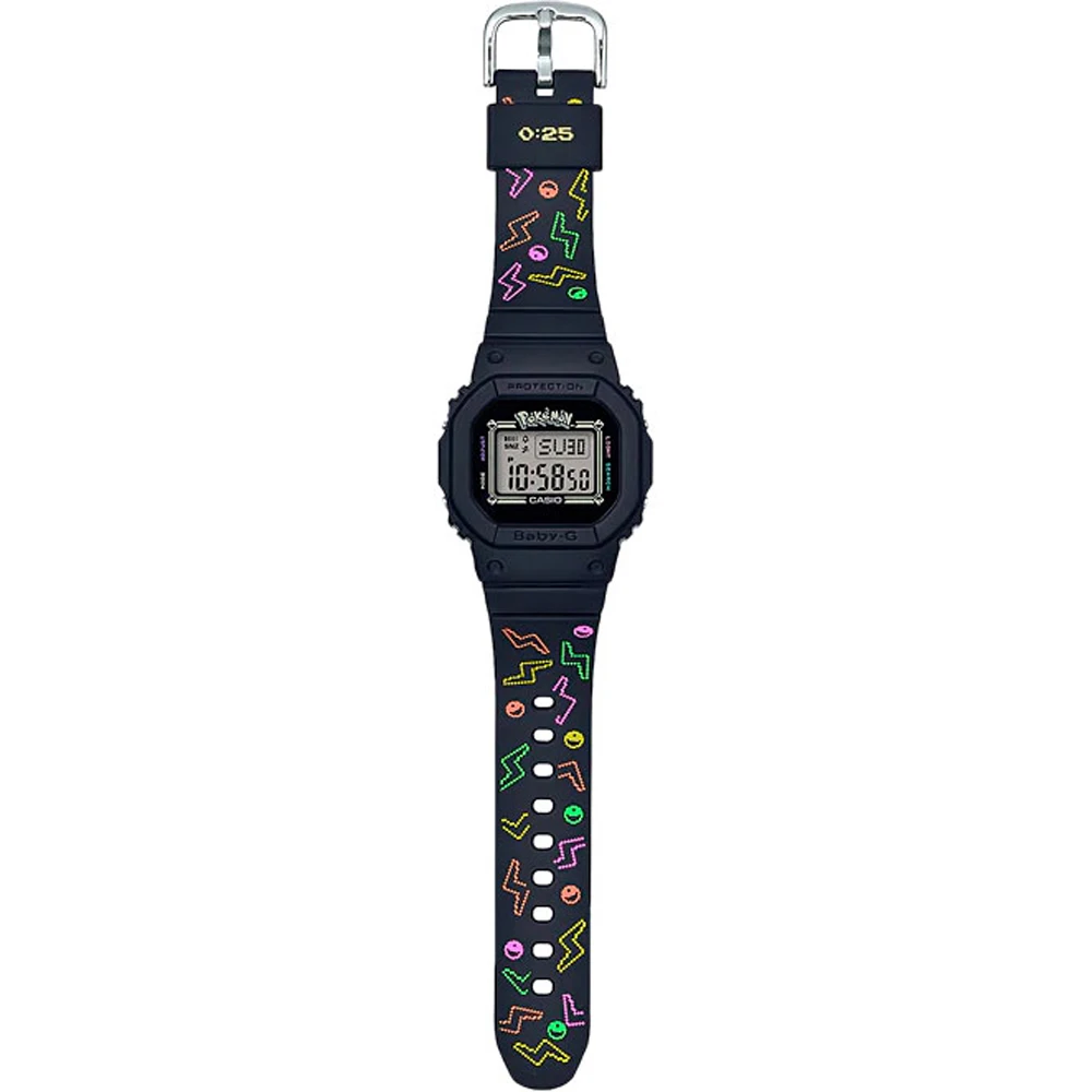 Baby-G. Лимитированная серия. Эти часы - совместная работа Casio и компании The Pokemon. Модель выпущена в честь совместного 25-летнего юбилея коллекции Baby-G и The Pokemon. Белая электролюминесцентная подсветка освещает весь циферблат и после отпускания кнопки продолжает светиться еще некоторое время. При включении подсветки на циферблате появляется изображение покемона Пикачу. Мировое время – 48 городов (29 часовых поясов). Функция включения/отключения летнего времени. 12-ти и 24-х часовой формат времени. Секундомер с точностью показаний 1/100с и временем измерения 1ч. SPLIT-хронограф. Таймер обратного отсчета от 1сек до 24ч. Функция включения/отключения звука. Противоударный корпус защищает механизм от ударов и вибрации. Задняя крышка украшена выгравированным изображением покемона Пикачу. Ремешок из полимерного материала с изображениями молний и множества Poke Ball. Подарочная упаковка в виде большого Poke Ball.