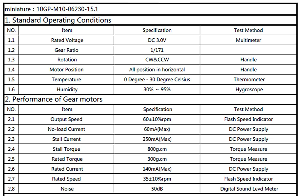 Больше используется для интеллектуальных машин, Дронов и т. д. Описание: Стандартные условия эксплуатации: Рабочая температура: 0 ℃ ~ 40 ℃; Диапазон относительной влажности: 30% ~ 85% относительной влажности; Диапазон температур хранения: -10 ℃ ~ + 60 ℃; Диапазон хранения относительной влажности: 10% ~ 80% относительной влажности; Условия тестирования: диапазон температур 20 ± 3 ℃, диапазон влажности 65 ± 5%; Направление вращения: CW при просмотре с выходной стороны вала; Рабочая Номинальное напряжение: 1,5 ~ 6В постоянный ток Номинальная мощность: 3 в Скорость выхода: 60 ± 10% об/мин Коэффициент скорости: 1:171