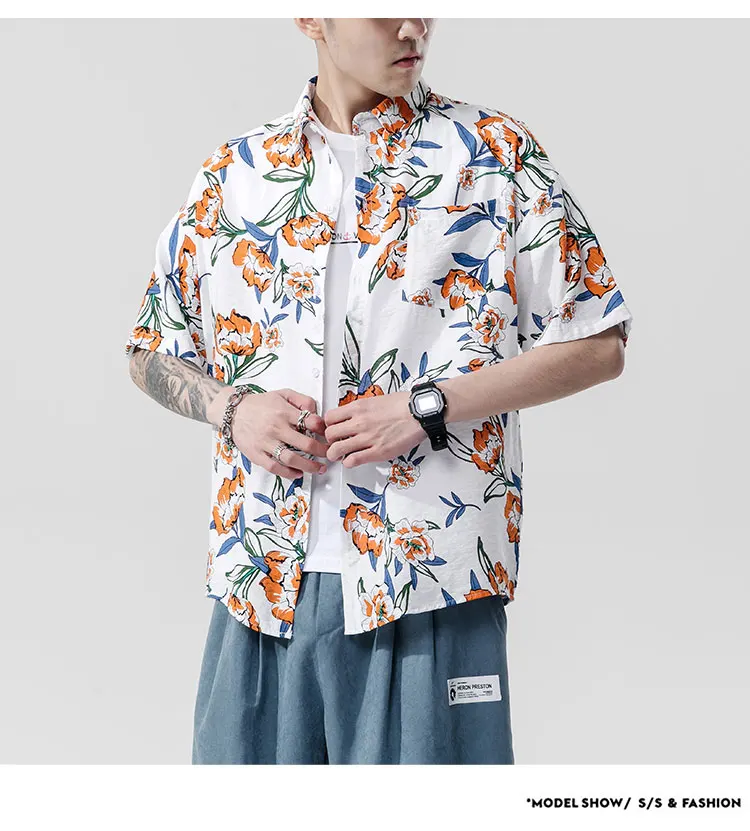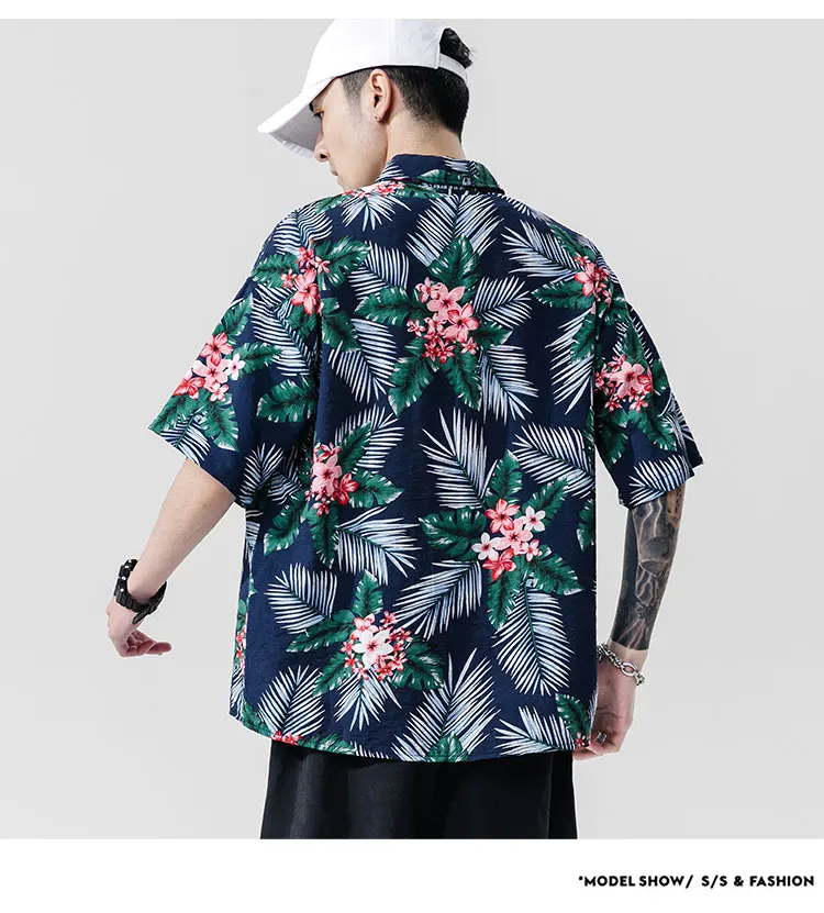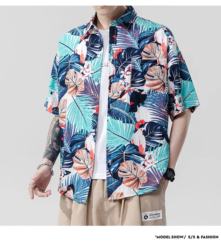 Вискоза 84.4% Полиамид 15.6% Тонкая, удобная и дышащая ткань Застежка на пуговицы Машинная стирка в холодной воде, машинная сушка низкая Сделано в Китае Яркая Печать придает тропический вид этой повседневной рубашке aloha прохлады и комфорта для пляжа или вне офиса Свободный крой: модный принт, свободная гавайская рубашка.