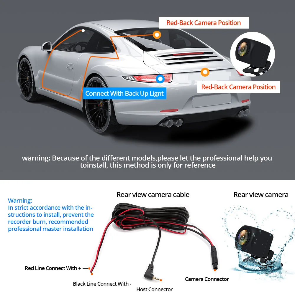 Пожалуйста, подключите красный кабель задней камеры с положительным полюсом питания обратной лампы автомобиля (+). А затем Подключите автомобильное зарядное устройство к прикуривателю для питания автомобильного видеорегистратора. Когда вы получите свой автомобиль в обратном направлении, Автомобильный видеорегистратор автоматически переключается на заднюю камеру с помощью линии парковки. Затем будет работать функция автоматического реверса.