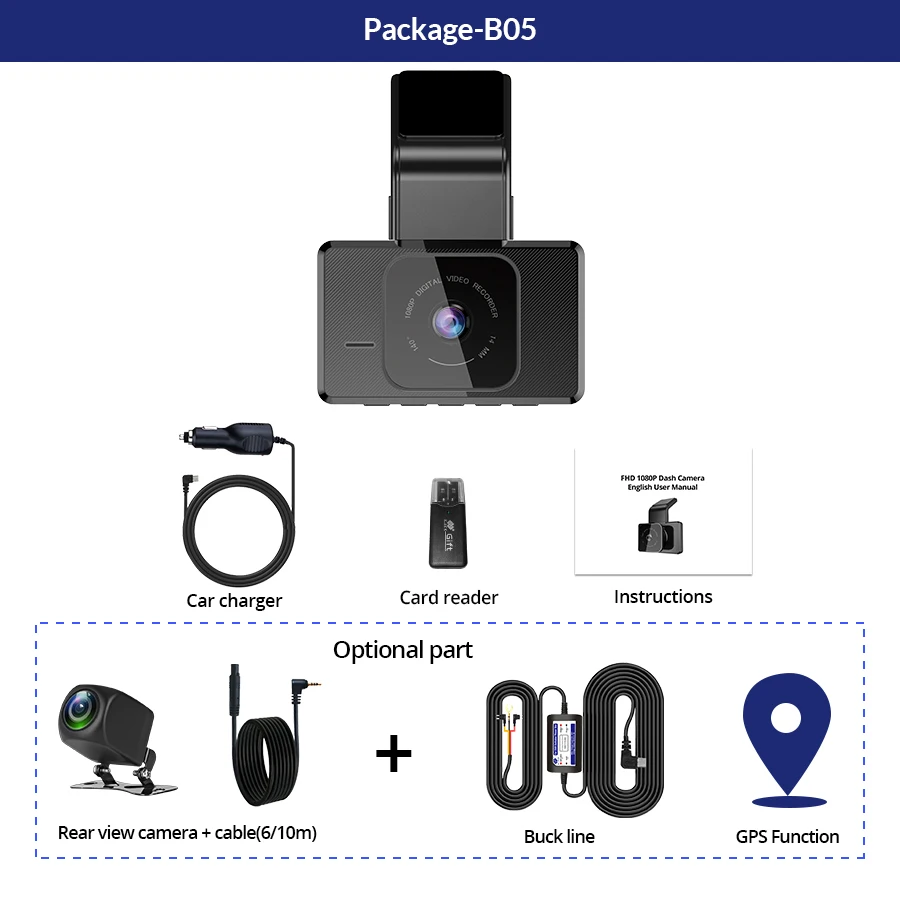 -1 видеорегистратор -1 зарядное устройство -Руководство пользователя-1 шт. -1 шт., держатель 3м с Встроенный GPS -1 x устройство для чтения карт USB (подарок) -1 x камера заднего вида с кабелем 6 метров -1 x понижающая линия для 24H мониторинга парковки