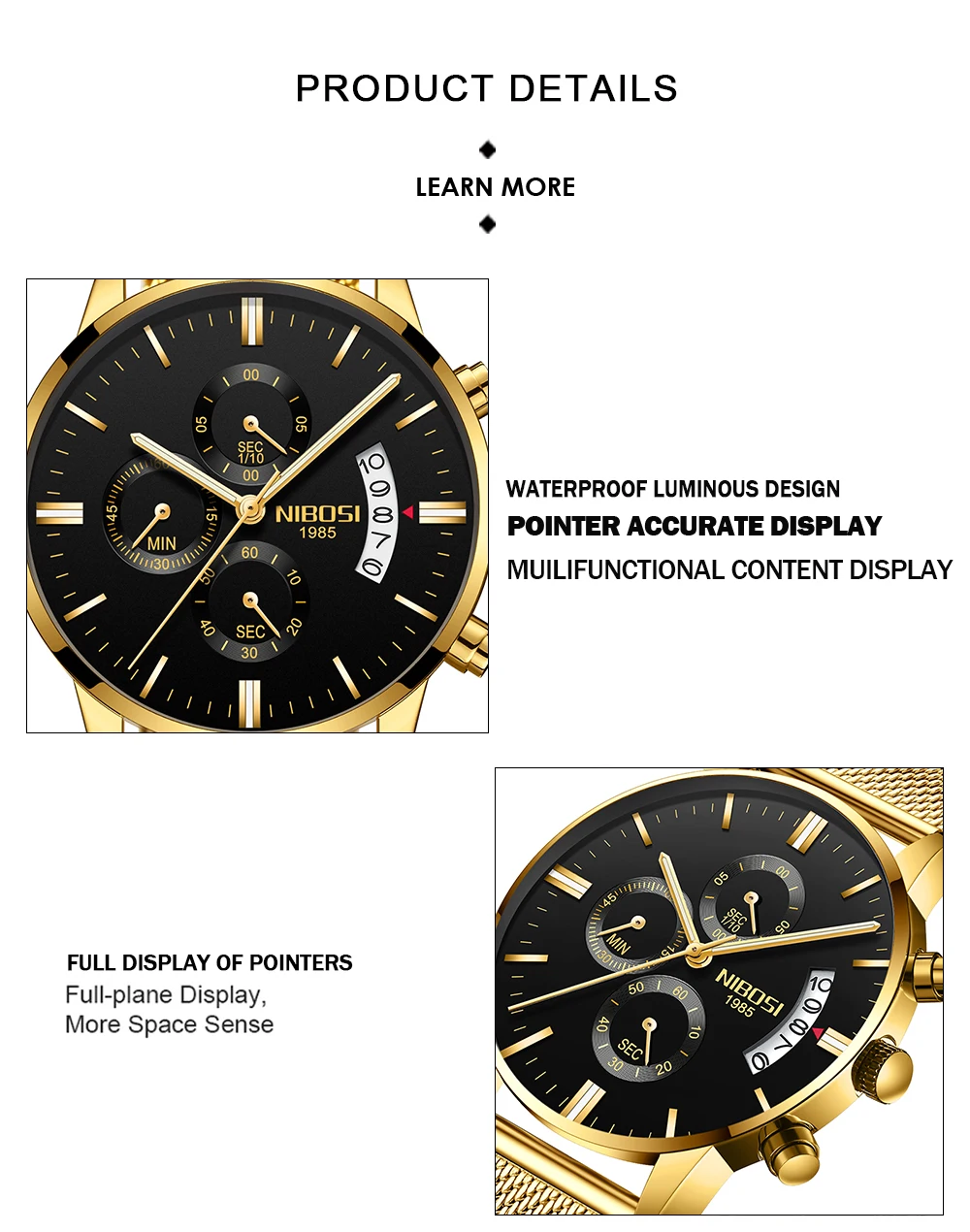 Название бренда: NIBOSI Тип застежки: скрытая застежка с кнопкой Материал корпуса: нержавеющая сталь Чехол Толщина: 10,63 мм Ширина ремешка: 22 мм Номер модели: 2309 Диаметр циферблата: 43,69 мм Стиль: модный роскошный спортивный бизнес