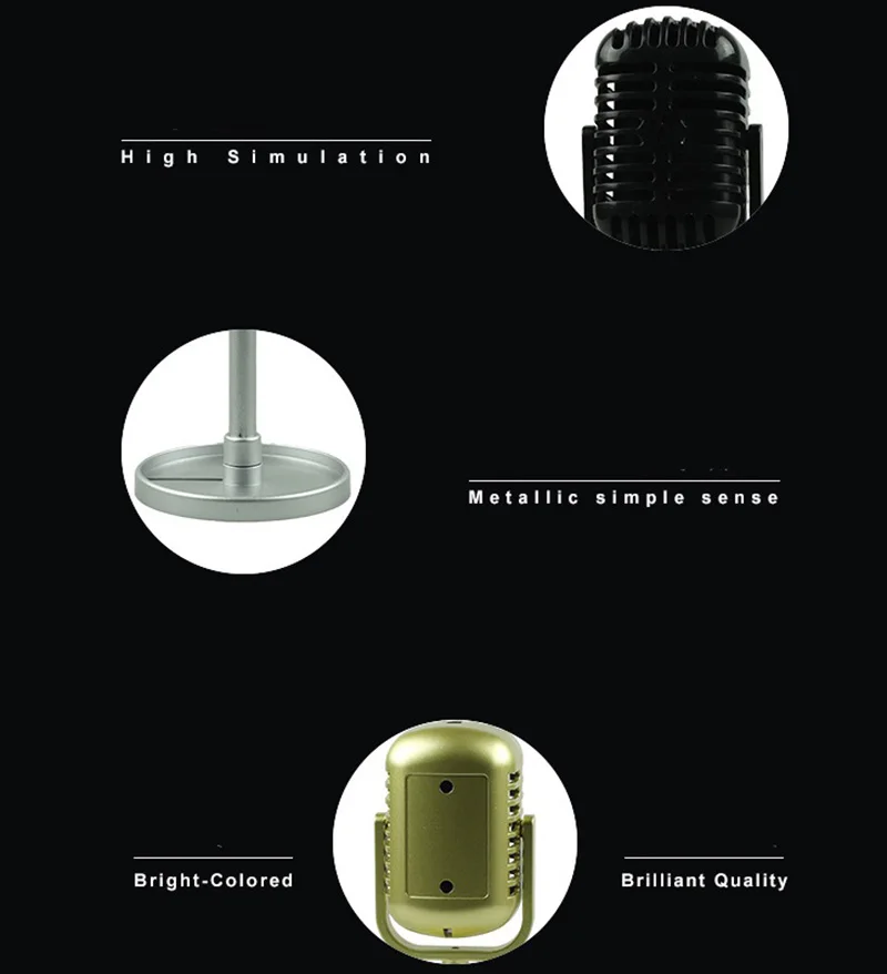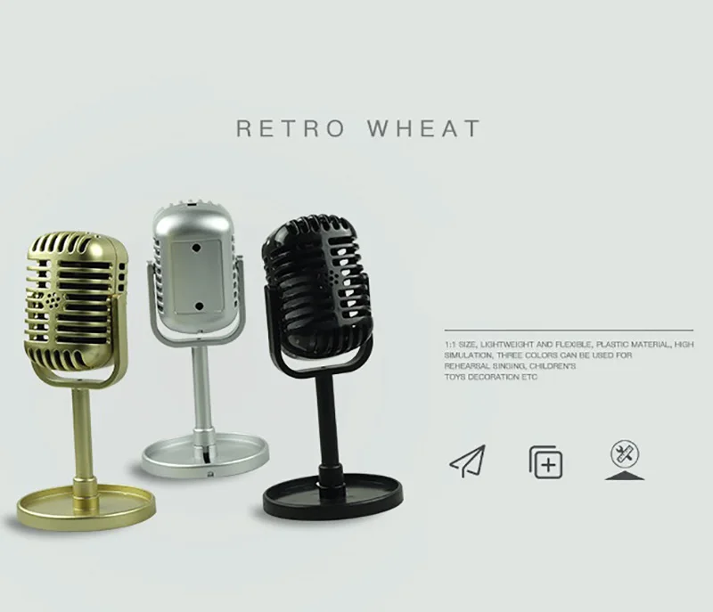Параметры Название продукта: Ретро микрофон реквизит Цвет: черный, золотой, серебряный Применение: Для общественных адресов или театральных звуковых систем Для вещания, записи и других звуковых приложений Упаковочный лист: 1 продукт, 1 руководство, 1 упаковочная коробка Обратите внимание: Все изображения и описания предназначены только для иллюстративных целей. Спецификация, функции и внешний вид продукта могут отличаться в зависимости от фактического использования. Отклонение цвета зависит от фактической конфигурации системы и небольшая разница в размерах Допускается из-за ручного измерения. Мы рекомендуем вам проверить у продавцов точные предложения, если нужно.