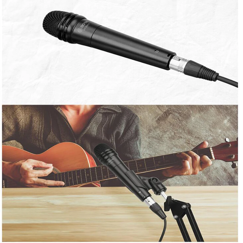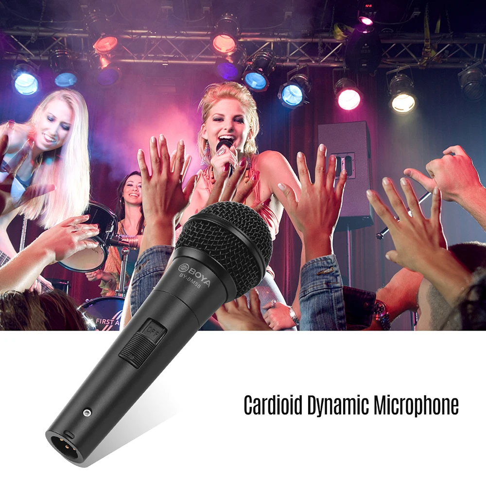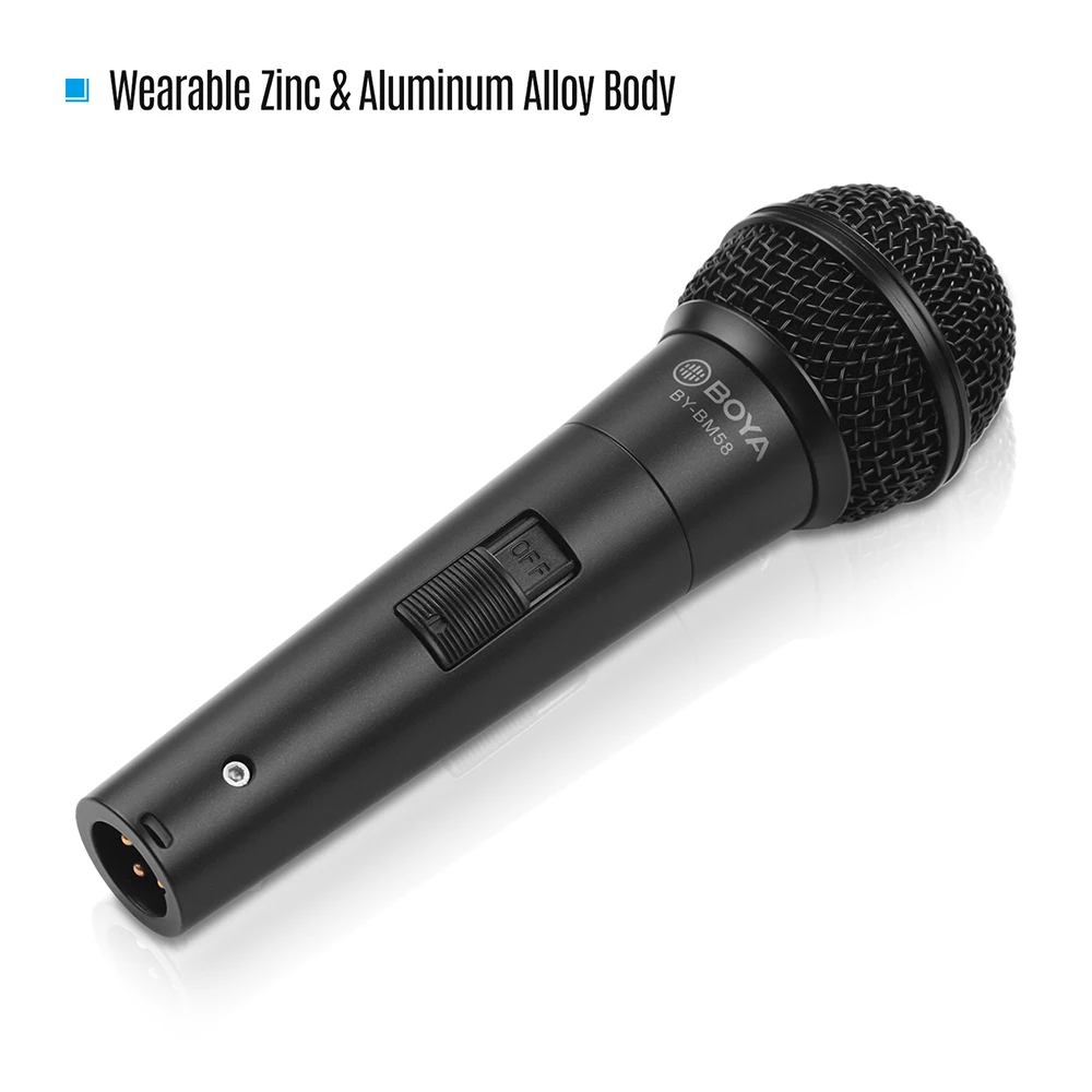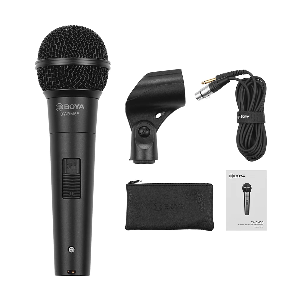 Кардиоидный динамический микрофон: микрофон BOYA BY-BM58 оснащен кардиоидным рисунком пикапа для лучшего усиления звука, минимизируя отзывы о фоновом режиме. Простота в использовании: удобный переключатель для управления вкл/выкл, плавный обмен позволяет переключать управление одной рукой. Компактный и удобный размер: Изготовлен из высококачественного цинкового и алюминиевого сплава, длиной 16,4 см/6,46 дюйма, микрофон очень удобно держать и носить в течение длительного срока службы. 3-контактный XLR Сделано в Китае для Великой китайской Совместимость: 5 м кабель XLR для широко совместим с DVD, звукомикшер, съемный динамик и аудио-усилитель и многое другое оборудование. Широкое применение: идеальный выбор для обеспечения отличного усиленного звука для караоке, живой сцены, театра, репетиций, свадьбы, встреч и многого другого. Особенности: Кардиоидный динамический микрофон: микрофон BOYA BY-BM58 оснащен кардиоидным рисунком пикапа для лучшего усиления звука, минимизируя отзывы о фоновом режиме. Простота в использовании: удобный переключатель для управления вкл/выкл, плавный обмен позволяет переключать управление одной рукой. Компактный и удобный размер: Изготовлен из высококачественного цинкового и алюминиевого сплава, длиной 16,4 см/6,46 дюйма, микрофон очень удобно держать и носить в течение длительного срока службы. 3-контактный XLR Сделано в Китае для Великой китайской Совместимость: 5 м кабель XLR для широко совместим с DVD, звукомикшер, съемный динамик и аудио-усилитель и многое другое оборудование. Широкое применение: идеальный выбор для обеспечения отличного усиленного звука для караоке, живой сцены, театра, репетиций, свадьбы, встреч и многого другого. Технические характеристики: Цвет: черный Материал: Цинковый и алюминиевый сплав Датчик: Динамический Диаграмма направленности: Кардиоидная Частотный диапазон: 50 Гц-15 кГц Чувствительность: -653 дБ, 2 дБ = 1 В/па, 1 кГц Выход импеданс: 300Ω Разъем: XLR до 6,35 мм штекер Кабель Длина: 5,0 m / 16.4ft Вес изделия: 354 г/12,49 унций Размер изделия: 16,4*5,3*5,3 см/6,46*2,09 * 2.09in Вес посылка: 780 г/27,51 унций Посылка Размеры: 23*13*9,5 см/9,06*5,12 * 3.74in Посылка список: 1 * кардиоидный микрофон 1*3-pin XLR до 6,35 мм штекер адаптера кабеля 1 * Крепление для микрофона 1 * сумка для переноски 1 * Руководство пользователя Mode2: BM-57 BY-BM57 динамический микрофон в форме сердца • Четкое воспроизведение музыкальных инструментов и вокала • Подходит для гитарного усилителя или басового усилителя, саксофона, трубы или барабана и других инструментов • Отличная направленность в форме сердца • Встроенный всплывающий фильтр • Прочные материалы из алюминиевого и цинкового сплава • Поставляется с выходным кабелем XLR Canon и подставкой для микрофона BY-BM58 ручной микрофон с подвижной катушкой в форме сердца • Идеально подходит для записи голоса, например, пения и разговоров • Отличная направленность в форме сердца • Сетчатая крышка помогает уменьшить шум • Встроенный всплывающий фильтр • Материалы из алюминиевого и цинкового сплава • Индивидуальное изготовление амплитудно-частотная характеристика • Включает аудиокабель XLR и адаптер с поворотным кронштейном