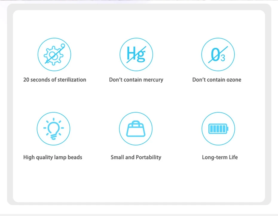 Емкость аккумулятора: 380 мАч Время зарядки: 1,5 ч Время устойчивого использования: 7-8 ч Спецификация входного сигнала: 5В 1а Мощность УФ-лампы: 5 Вт Режим питания: Micro USB Длина волны лампы для дезинфекции UVC + UVA: 260-280nm