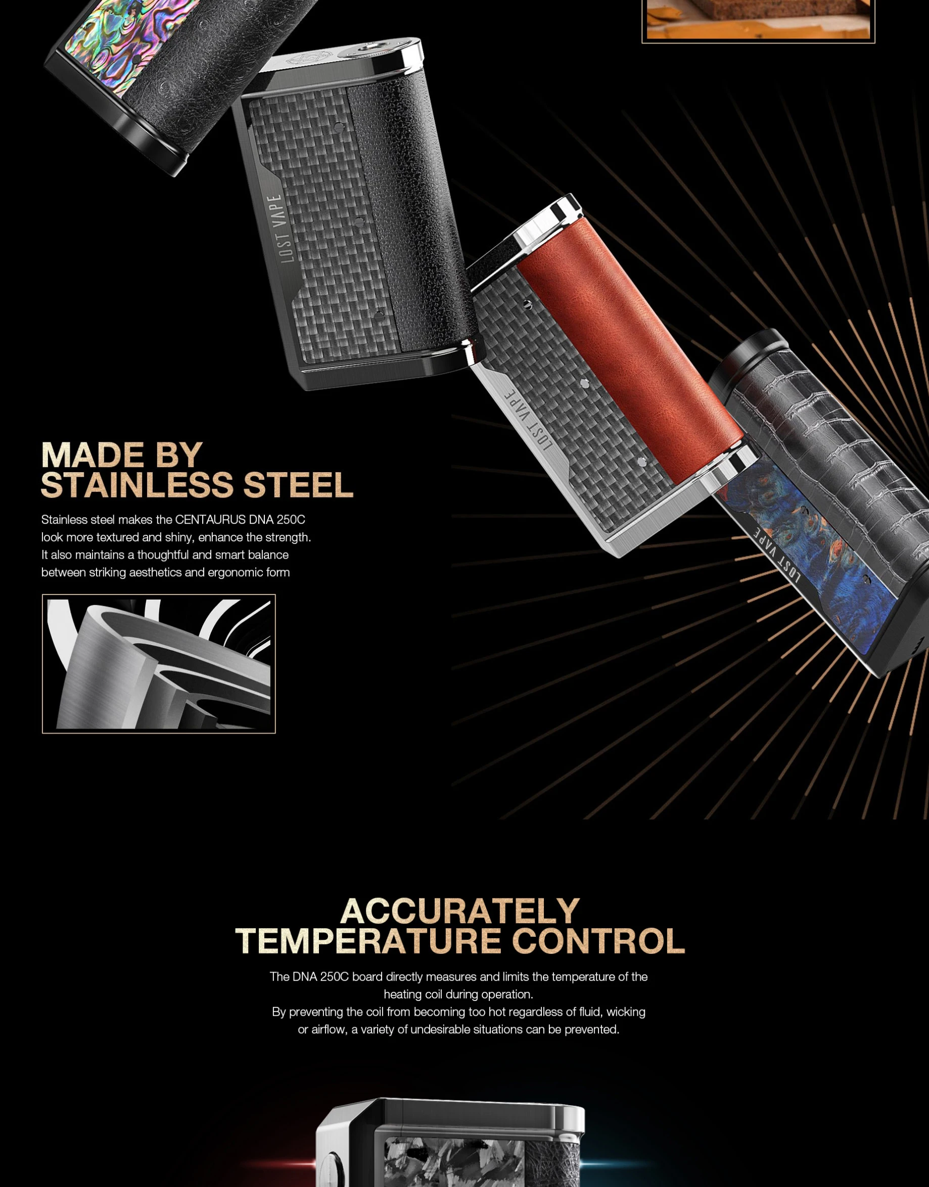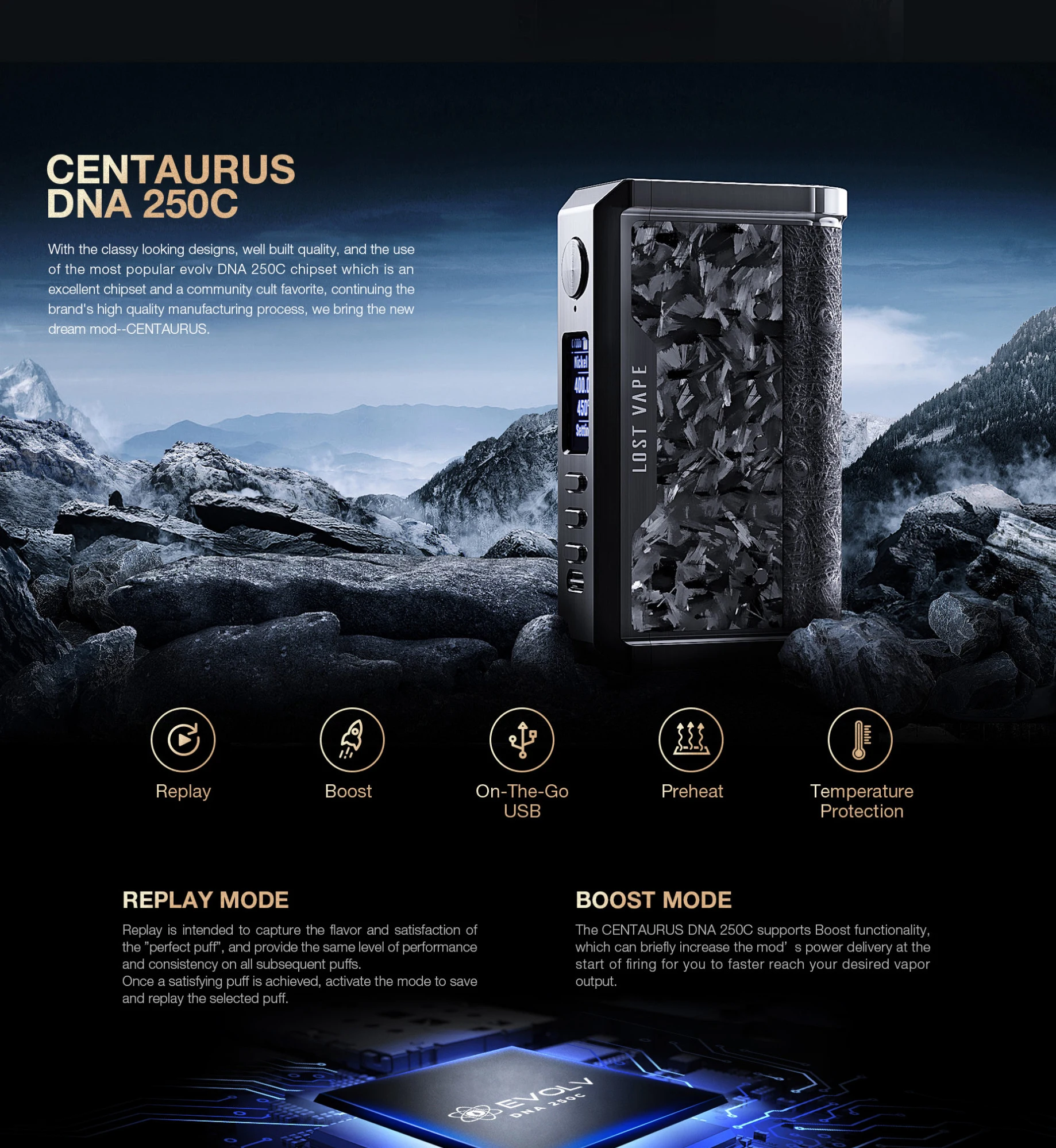 Мод Centaurus DNA250C питается от двух аккумуляторов 18650, которые могут нарисовать до 200 Вт мощности. Он использует самый популярный Evolv's DNA 250C. С режимом воспроизведения, Centaurus DNA250C мод предлагает вам тот же уровень производительности и последовательности на всех следующих затяжках. С режимом boost, Centaurus DNA250C мод может коротко увеличить подачу мощности и помочь вам достичь желаемого объема пара. Этот мод использует широкий ассортимент высококачественной натуральной кожи и сочетает в себе элегантный дизайн. Изготовлен из нержавеющей стали, выглядит более текстурированным и блестящим. Точная функция контроля температуры будет непосредственно измерять и ограничивать температуру нагревательной катушки во время работы. Он также поставляется с встроенным зарядным устройством, быстрой зарядкой и обновлением прошивки.