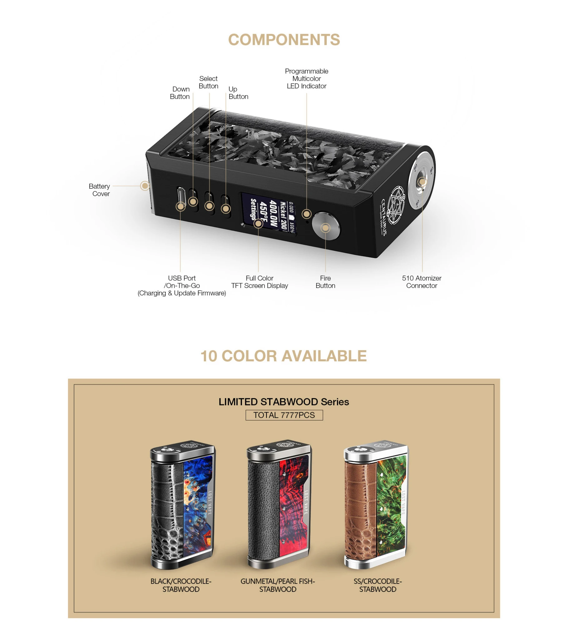 1. Цветной TFT дисплей 0,90 дюйма 2. Популярный набор микросхем evolv DNA 250C 3. С режимом Boost и функцией повтора 4. Поставляется с USB on-the-go 5. Две батареи 18650 с максимальной мощностью 200 Вт 6. Уникальные панели из роскошной кожи 7. Сделано из нержавеющей стали 8. Точный контроль температуры 9. Поставляется с тремя сериями: серия из углеродного волокна, серия Abalone, серия Stabwood 10. USB зарядка и обновление прошивки 11. Множественная защита безопасности: атомайзер/короткого замыкания/слабый аккумулятор/температура/защита от обратной полярности на борту и защита от низкого/высокого сопротивления