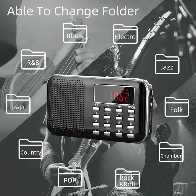 Upgraded to 1200mah rechargeable and replaceable battery, which can provides more than 8 hours continuous play time. With low battery and charging tips, you don't have to worry about the danger of sudden shutdown or overcharging.With folders switching function, you can switch between your Favorite singers' albums, one to another freely.