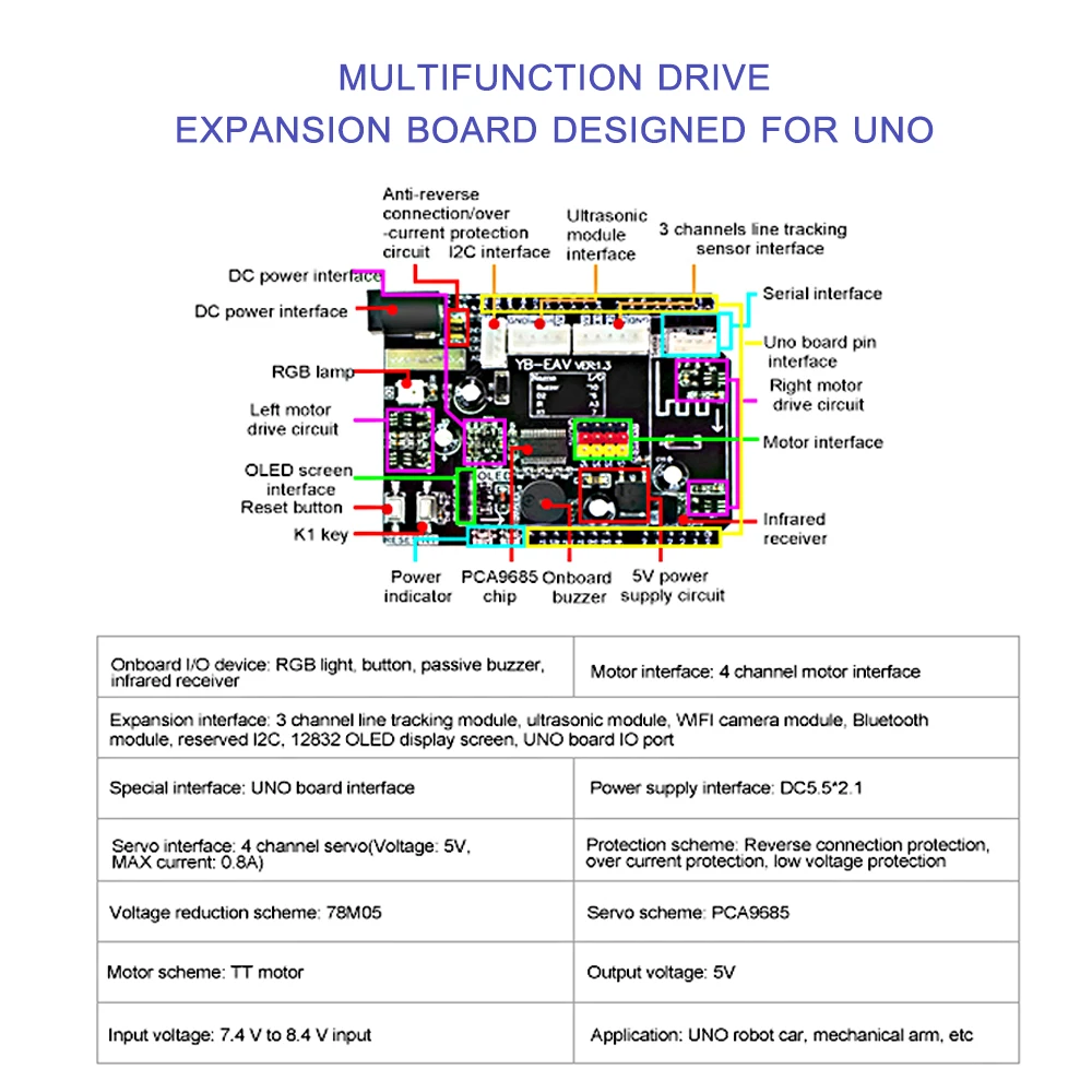 Многофункциональная Плата расширения привода --- специально разработана для платы разработки UNO и может быть непосредственно вставлена в плату разработки UNO без кабеля. С защитой от обратного хода, защитой от перегрузки по току, защитой от низкого напряжения батареи и другими схемами эффективно защищают блок питания и расширительную плату.