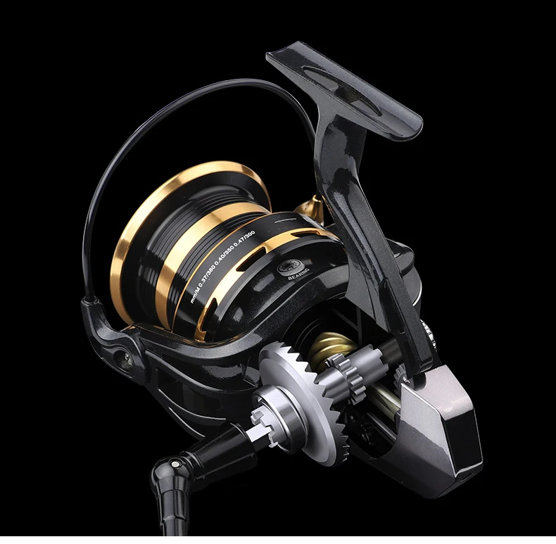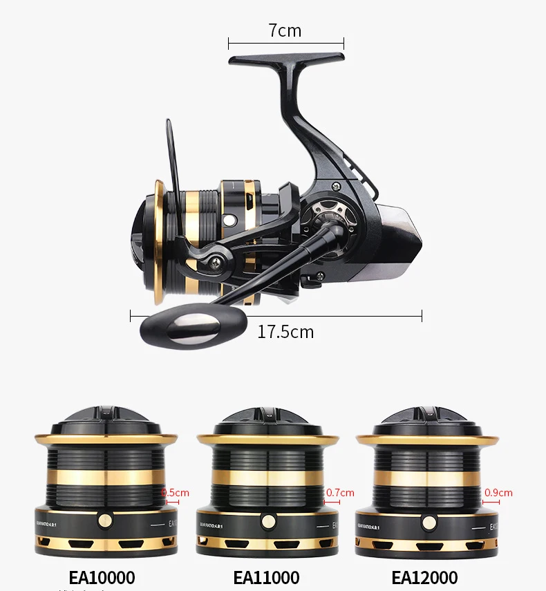 Большая Рыболовная катушка 10000/12000 модель Полностью металлический складной Кулисный рычаг, взаимозаменяемая левая и правая рука, мягкая резиновая ручка, удобная на ощупь. Прочный корпус, стабильный продукт и высокая работоспособность. Металлическая проволочная чашка из алюминиевого сплава, полностью металлический складной рокер, без зазора.