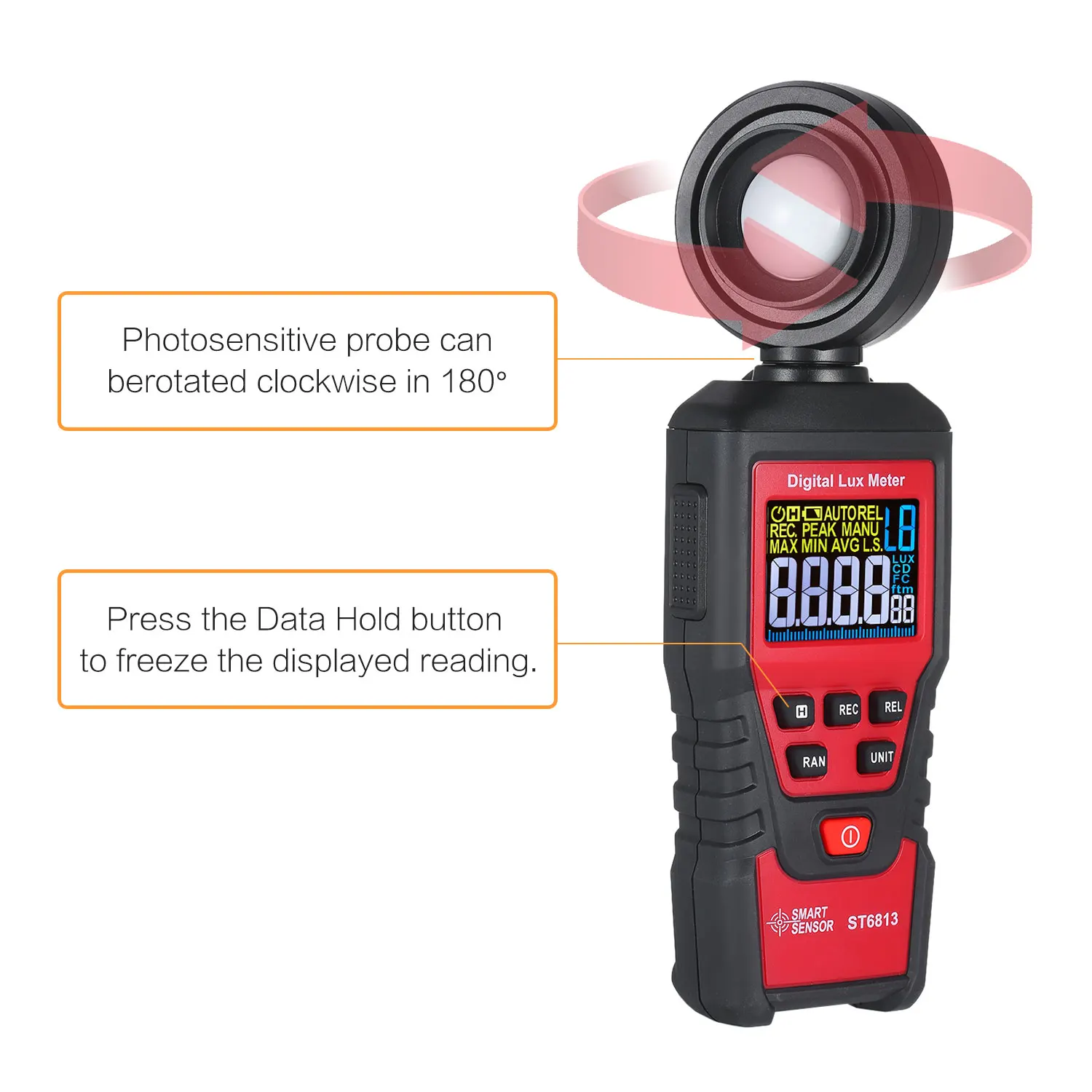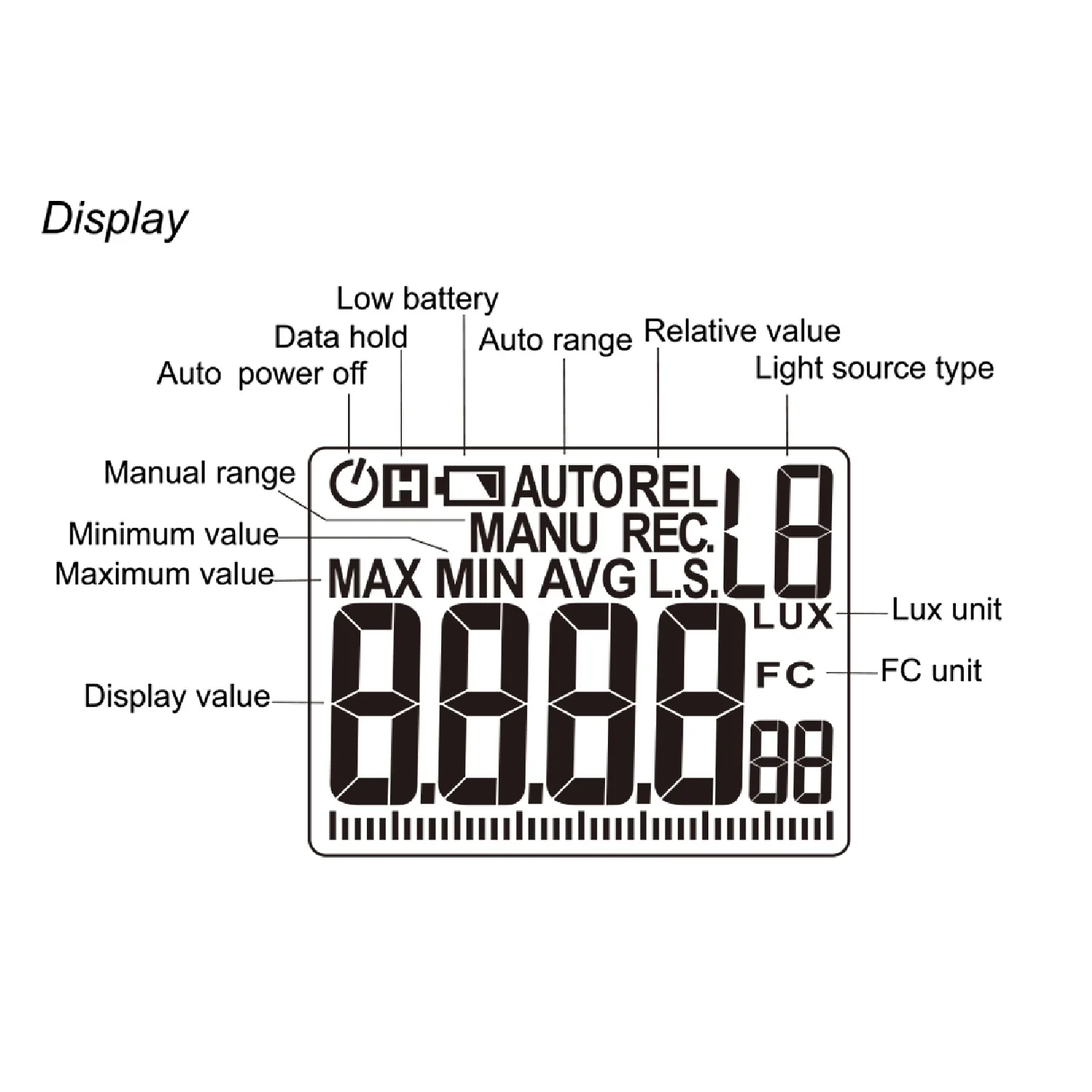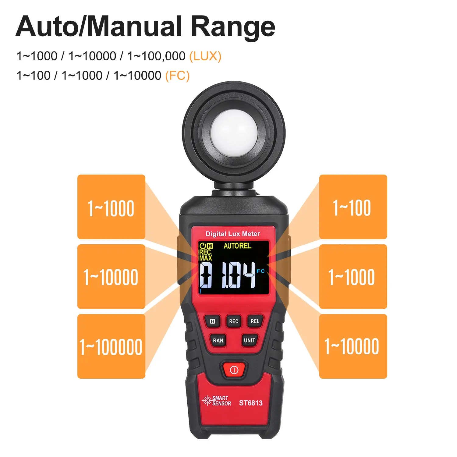 [Практический Функция]Нажмите кнопку удерживания данных, чтобы заморозить отображаемое считывание; Автоматический/ручной диапазон для точного измерения; Возможна Конвертация между Lux и FC.