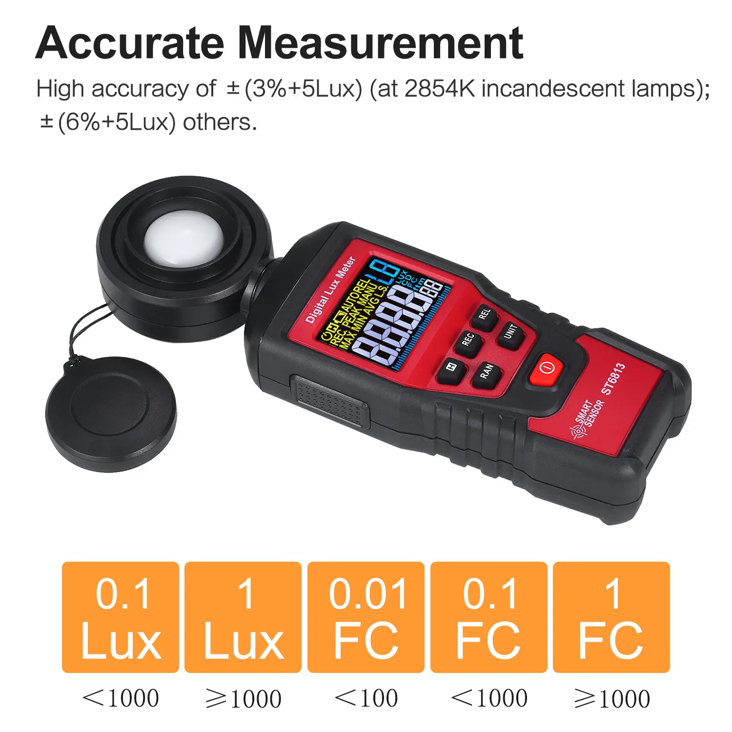 [Точное измерение]Высокая точность ±(3% + 5Lux) (при 2854K лампах накаливания); ±(6% + 5Lux) другие.