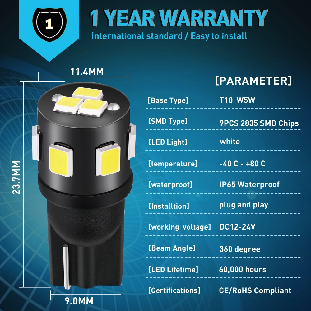 Название: T10 W5W светодиодный лампы Материал: алюминий + светодиодный Светодиодный Тип: 9SMD-2835Chips Светодиодный Цвет: белый Срок службы: до 50000 + часов Напряжение: DC12V (нет для грузовика)