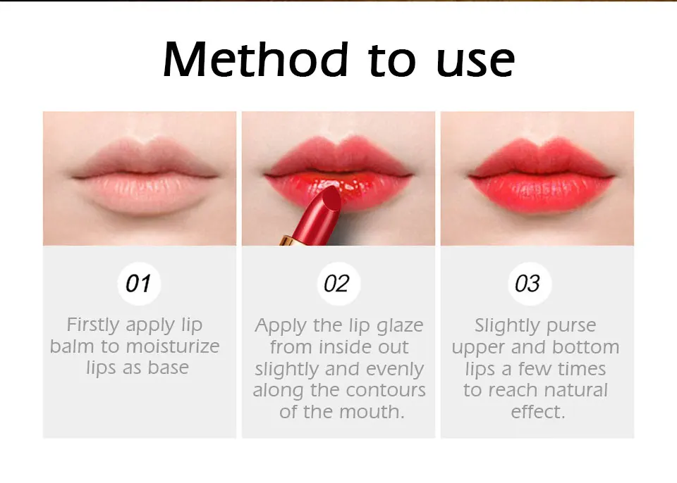 Способ использования💄 1. Сначала нанесите бальзам для губ, чтобы увлажнить губы в качестве основы 2. Нанесите глазурь на губы изнутри, слегка и равномерно вдоль контуров рта. 3. Несколько раз для естественного эффекта немного отделяет верх и нижние губы.