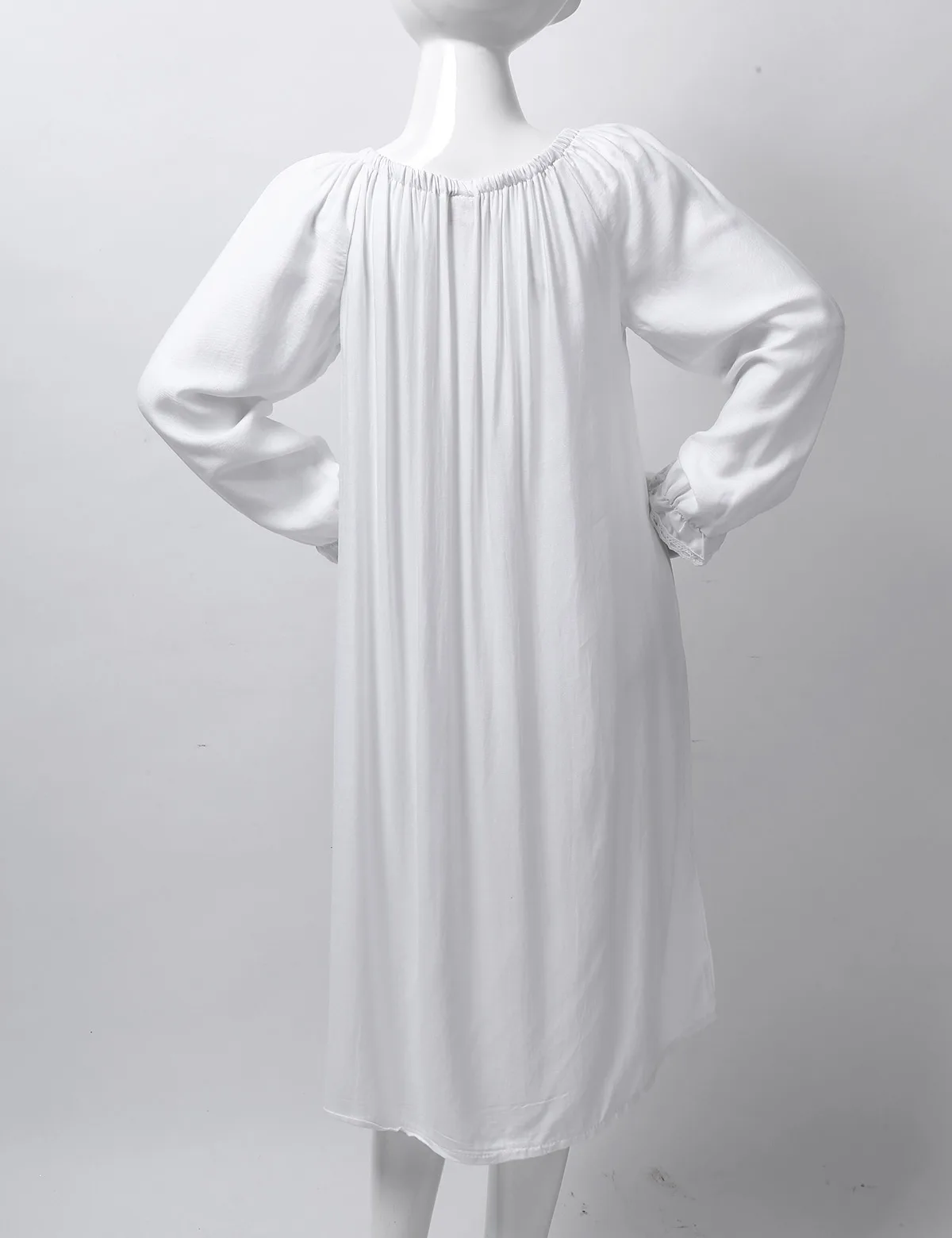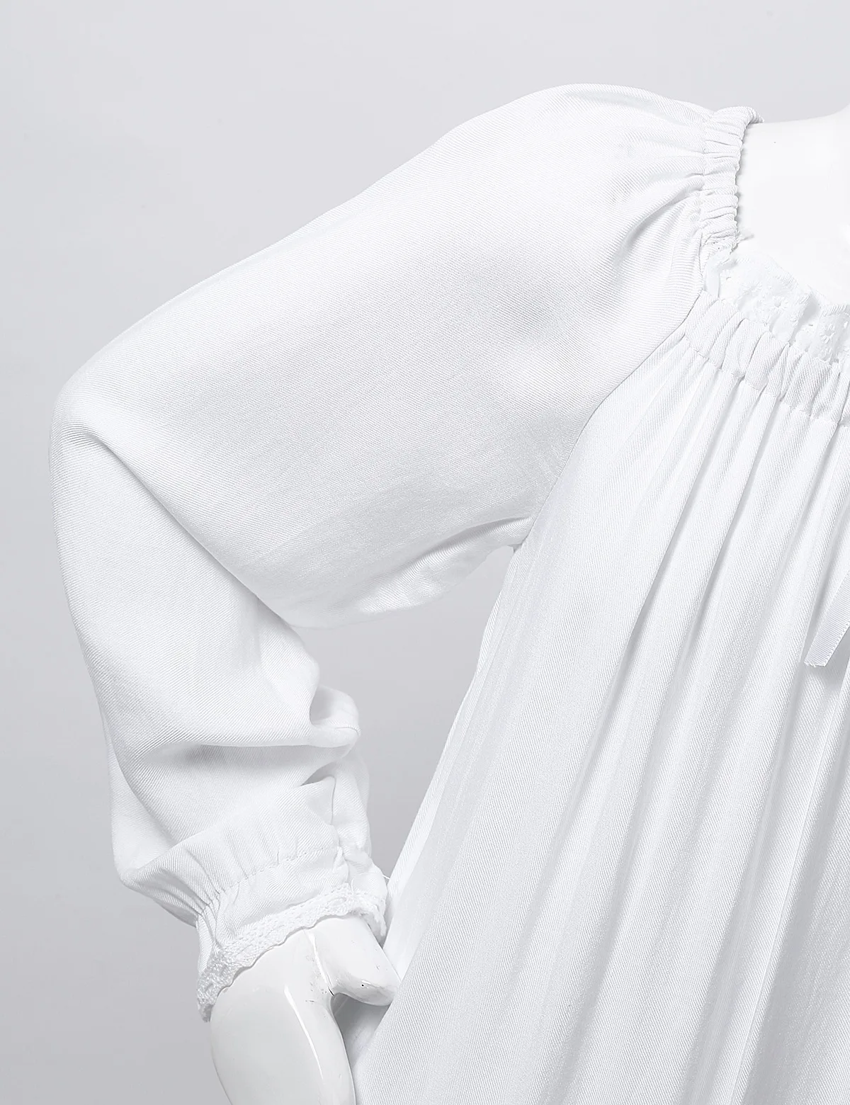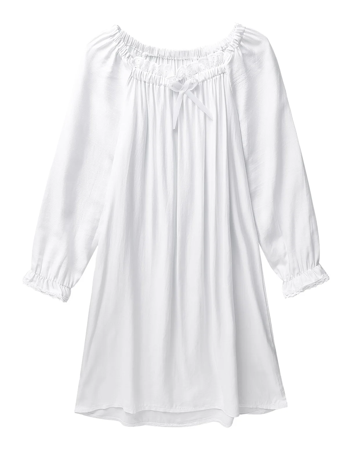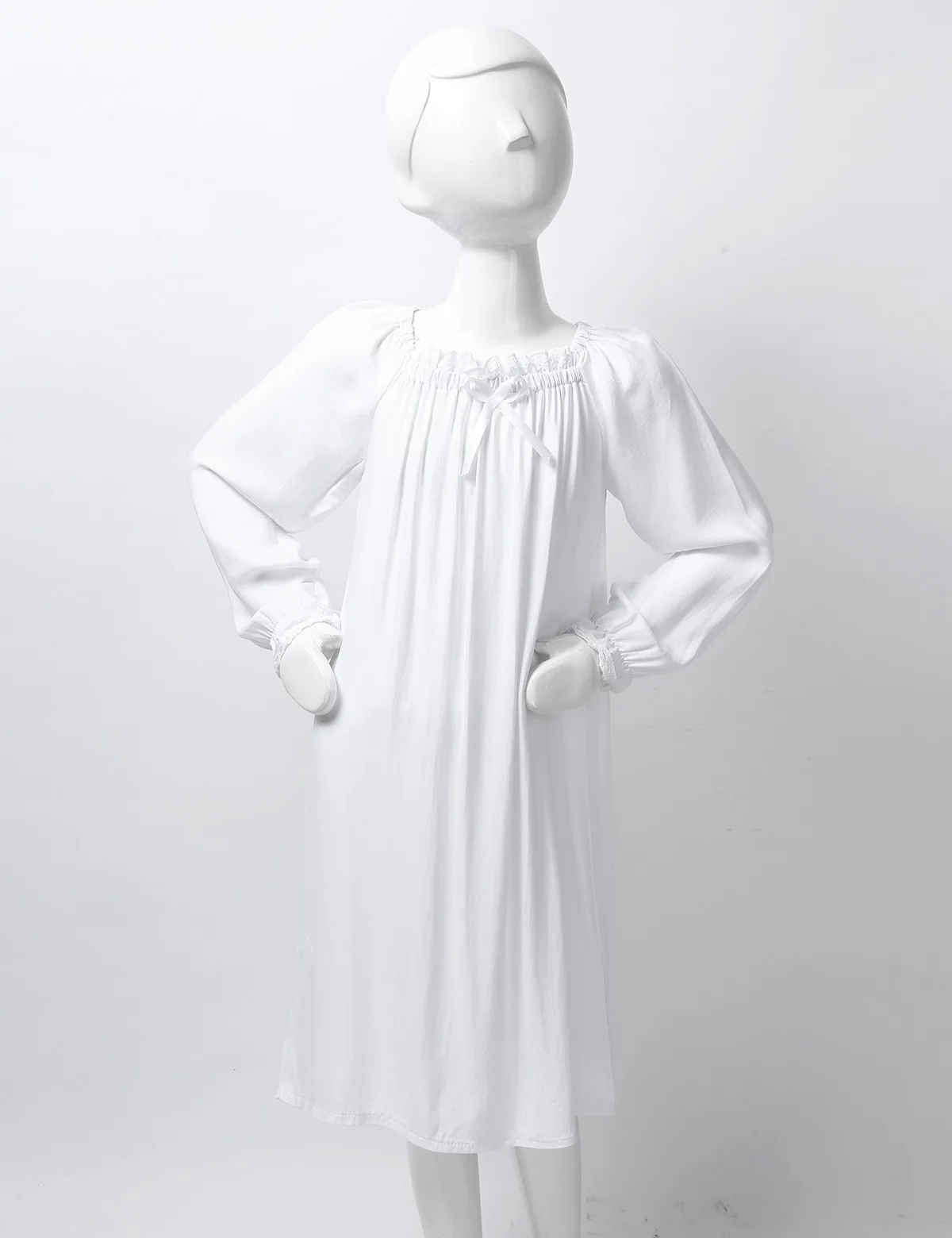 С длинными рукавами, нежным кружевным квадратным вырезом и бантом. Винтажный стиль, свободный дизайн, полная длина.
