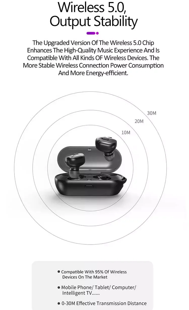 1. Аккумулятор для наушников: 50 мАч * 2 2. Аккумулятор зарядного устройства: 400 мА · ч 3. Версия Bluetooth: 5,0 4. Расстояние передачи: 10 м 5. Чип: Realtek 6. Время использования: 5-6 часов 7. Время зарядки наушников: 1-2 часа 8. Время зарядки чехол: 3,5 часа 9. Вес нетто наушников: 5,5 г * 2 10. Размер зарядного устройства: 90*38*30 мм 11 Размер упаковки: 135 мм * 100 мм * 35 мм