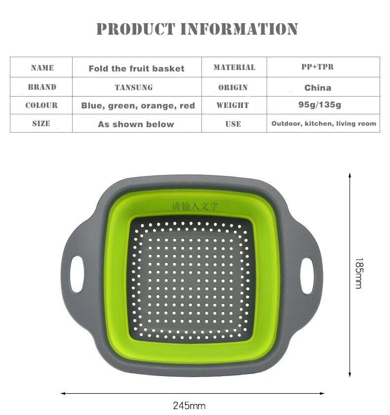 Название продукта: складная корзина для овощей/фруктов Цвет изделия: синий, зеленый, оранжевый, красный Материал изделия: ПП + ТПР Место производства: Китай (материк) Вес изделия: 95 г/135 г Размер изделия: см. Подробный чертеж для параметров продукта Маленькая корзина для фруктов: Вес: 95 г, высота в сложенном виде: 30 мм, открытая Высота: 80 мм Большая корзина для фруктов: вес: 135 г, высота в сложенном виде: 35 мм, открытая высота: 90 мм