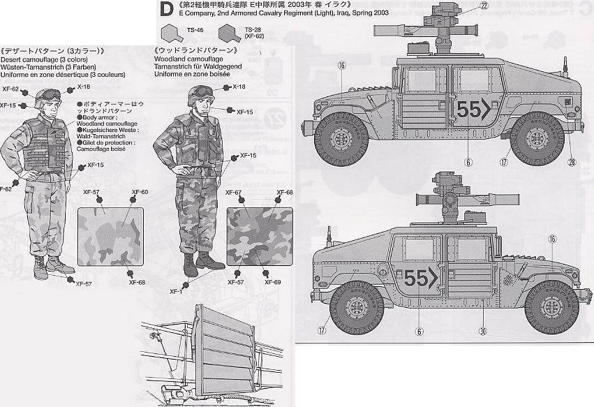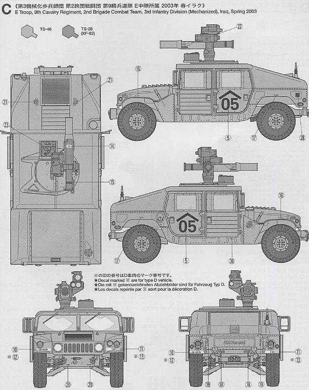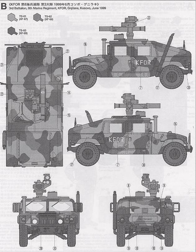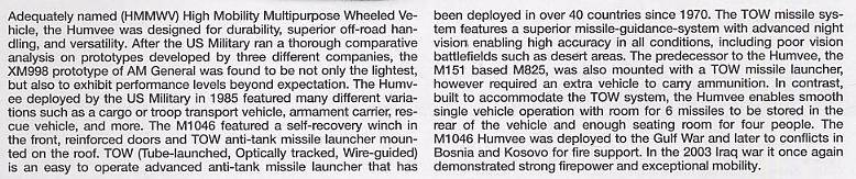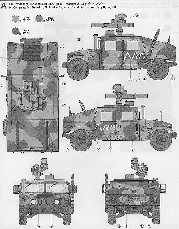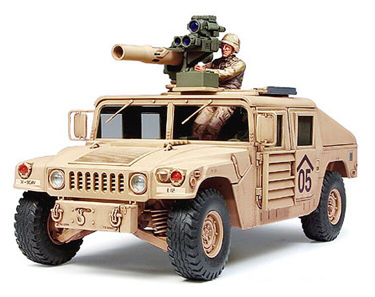 【 M1046 ハンビー буксировочный ミサイルキャリヤーについて 】1985 年から部隊配備されているアメリカ軍の多用途車ハンビー 。 ボディや搭載装備の組合せにより 、 カーゴ? 兵員輸送型 、 救急車 、 そして武装搭載型など 幅広い任務に対応したタイプが作られています 。 中でも対戦車兵器として 1970 年代に採用されたtowミサイルランチャーを搭載し 、 フロントウインチと強 化タイプのドアを装備したのが M1046 です 。 世界各地のアメリカ軍部隊に配備された M1046 は 、 火力支援に大きな働きを見せています 。 また湾岸戦争で 問題となった味方による誤射や誤爆への対策として 、 CIP(戦闘識別パネル)が開発され 、 イラク戦争で前線に出動したハンビーにも装着されていました 。