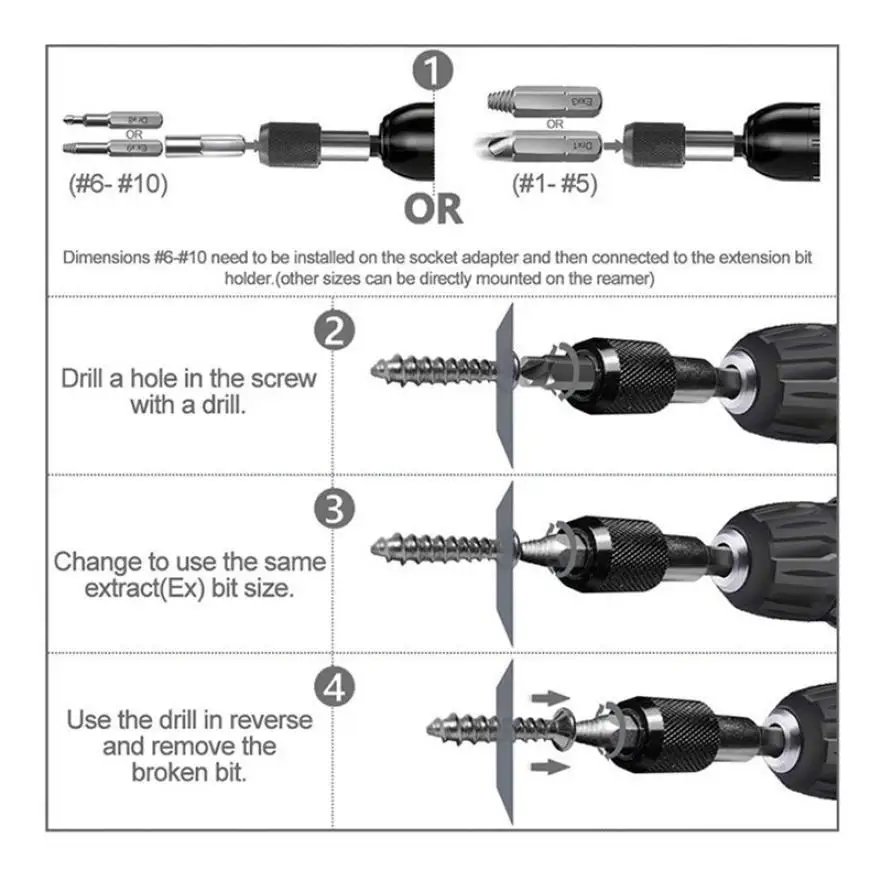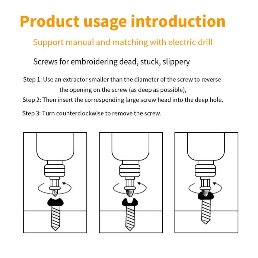 1. Изготовлен из высококачественной высокоскоростной стальной 4241. Он обладает высокой твердостью и долговечностью, и его легко разбирать поврежденные винты. 2. Поддержка ручного и соответствия с электрической дрелью. 3. Винты для вышивания мертвых, Застрявших, скользких проводов. 4. Многоцелевой, подходит для болтов, механических винтов, болтов с квадратной головкой, деревянных винтов, шестигранных болтов, винтов из листового металла и т. д.