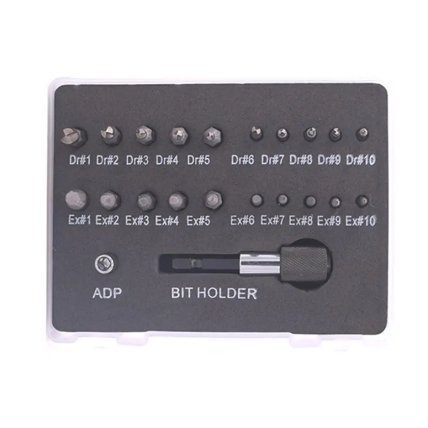 Материал: 4241 HSS. Размер: Dr01,Dr02,Dr03,Dr04,Dr05,Dr06,Dr07,Dr08,Dr09,Dr10. Ex01,Ex02,Ex03,Ex04,Ex05,Ex06,Ex07,Ex08,Ex09,Ex10. Цвет: металлический цвет (как на картинке). Стиль: Красная пластиковая коробка: Серебряный Блестящий шатун. Прозрачная белая пластиковая коробка: черный накатанный шатун. Посылка включает в себя: 22 * Винтовые Экстракторы