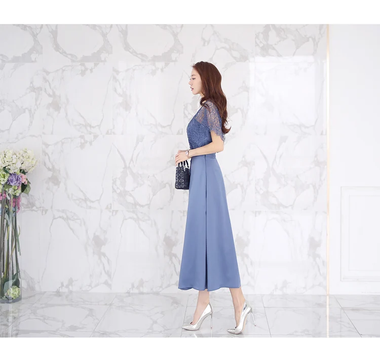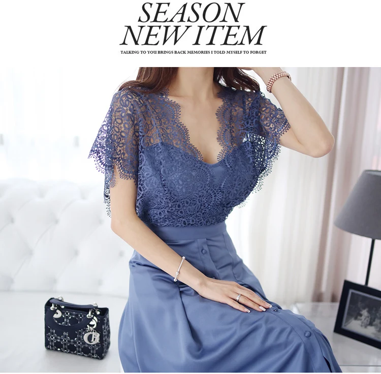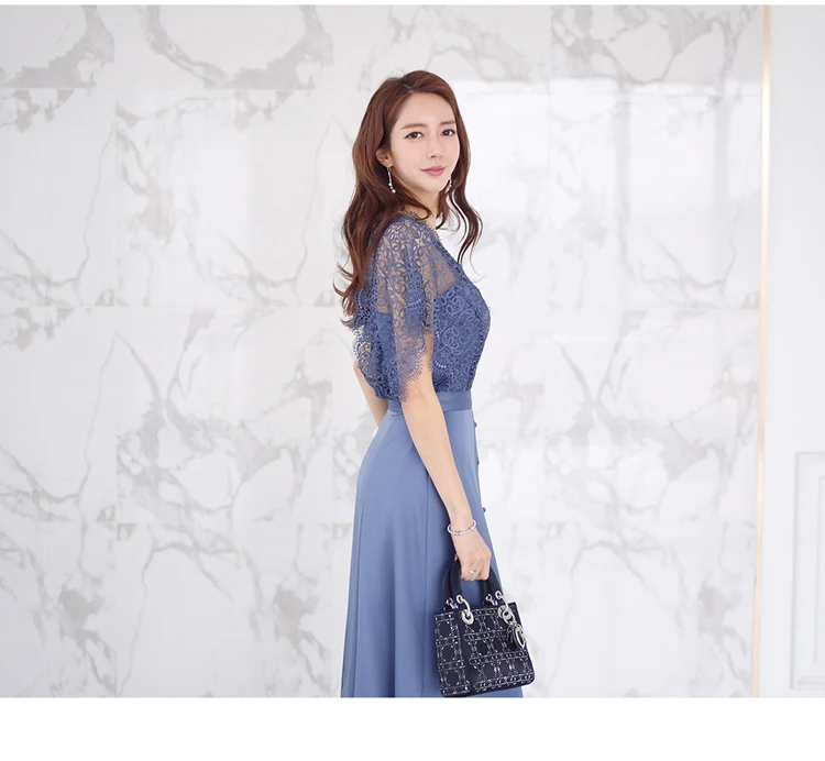 2020 Летние Элегантные Винтаж кружевное лоскутное платье трапециевидной формы платье Синий Для женщин с v-образным вырезом горловины и breased Длинные платья OL Vestidos AQ100