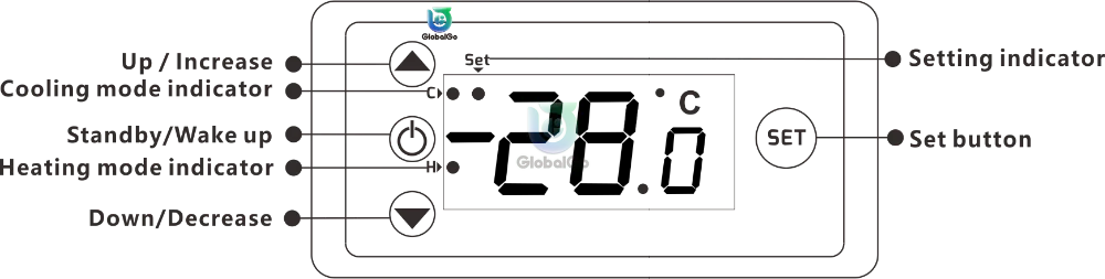 При нормальном рабочем состоянии контроллера экран отображает текущее значение температуры; Также контроллер может также Переключить режим работы между нагревом и охлаждением.