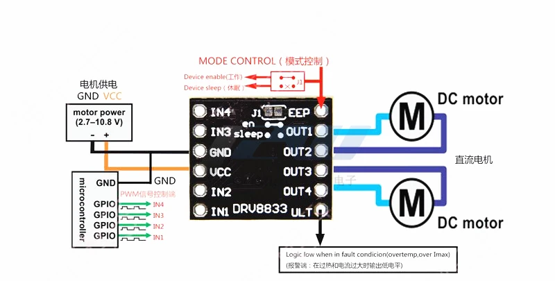 Низкий уровень EEP-это режим сна (необходимо отключить короткий контакт J1 за модулем, модуль подключен и подключен к высокому уровню по умолчанию); OUT1 и OUT2 1-way H-мосты, что соответствует IN1 и IN2; OUT3, OUT4-второй мост H, соответствующий контроль IN3, IN4; ULT-это защита от сигнала тревоги. Когда происходит перегрев и защита от перегрузки по току, сигнал тревоги низкого уровня выводится.