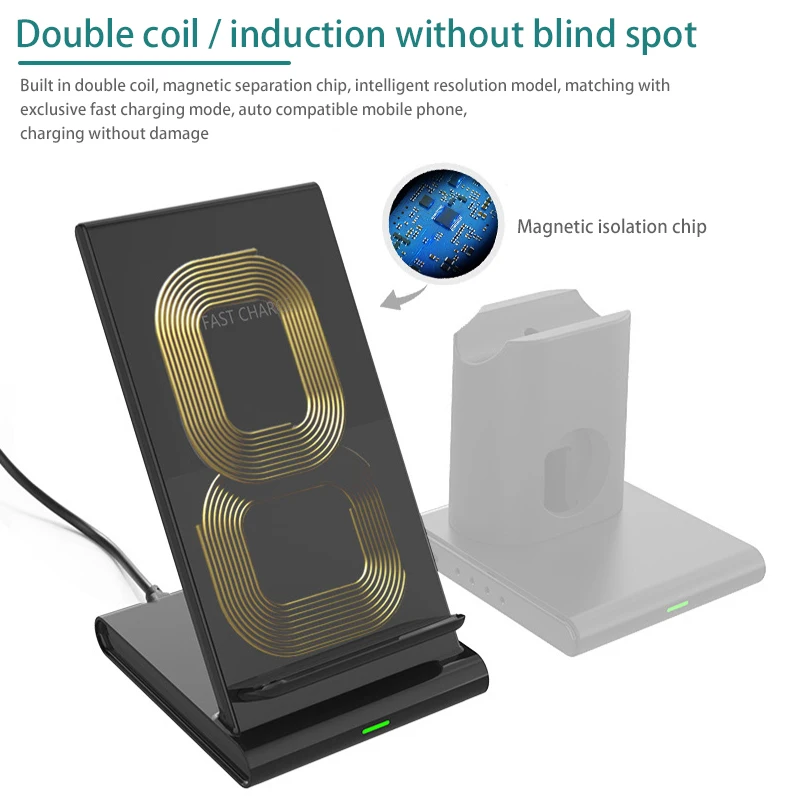 Характеристики: Вход: 5V/2A, 9В/1.8A Беспроводной зарядки Мощность: 10 Вт 7,5 Вт 5 Вт Стандарт: Qi Эффективность зарядки: ≥ 75% Расстояние зарядки: <8 мм Упаковочный лист: 1 x подставка для беспроводного зарядного устройства Кабель типа C-1 шт. 1 x Руководство пользователя 3 в 1 Беспроводное зарядное устройство: Он позволяет заряжать ваш мобильный телефон, Apple Watch и AirPods 1,2 для AirPods Pro беспроводным способом одновременно. Зона зарядки телефона может заряжать телефон, который соответствует стандарту Qi и поддерживает беспроводную зарядку. (Примечание: Используйте адаптер 9 В/2 А, 9 В/1,67 а для достижения функции быстрой зарядки.) Совместимость: область зарядки телефона: Поддерживает режим быстрой зарядки 10 Вт (для Samsung Galaxy S10/S10 +/S10e, Note 10/10 +/9/8, S9/S8/S7 edge); 7,5 Вт Режим (для iPhone 11 Pro Max/11/11/Xs/Xr/Xs Max/X/8/8 +); 5 Вт режим (для смартфона, поддерживающего беспроводную зарядку, как, например, для Samsung S6/S6 края, для Google Nexus 4/5/6/7 HD, для LG G6 (версия для США)/D1L/LTE2/G2/G3/G Pro/AS870, для SONY Xperia Z2/Z3V.) Область зарядки часов: только для Apple watch Series 1/2/3/4/5 (38 мм, 40 мм, 42 мм, 44 мм). Простота в использовании: для airpods или для зарядной док-станции iwatch можно легко комбинировать с подставкой для беспроводной зарядки телефона с помощью встроенного магнита, и его также можно использовать отдельно d. Встроенные двойные катушки в подставке для беспроводной зарядки телефона, мобильный телефон можно разместить вертикально или горизонтально. Обратите внимание, что: для Airpods pro и для зарядки Apple watch кабель должен быть оригинальным, а для зарядки Apple Watch кабель не должен превышать 1 м/39,4 дюйма (часы и Air-Pods зарядный кабель не включены). Безопасная зарядка: обычно Заряжайте телефон, не снимая чехол толщиной менее 5 мм. (Примечание: пожалуйста, храните металлические предметы, такие как кредитные карты, монеты, металлические Чехлы и ключи, вдали от зарядного устройства, когда он заряжается.) Это зарядное устройство поддерживает перегрузки по току, перенапряжения, перегрева, перезарядки, защиты от короткого замыкания и т. Д. Для обеспечения безопасной зарядки. Изготовлен из высококачественного АБС-материала, он прочный и прочный; Противоскользящий силикон на дне может укрепить стабильность зарядного устройства.
