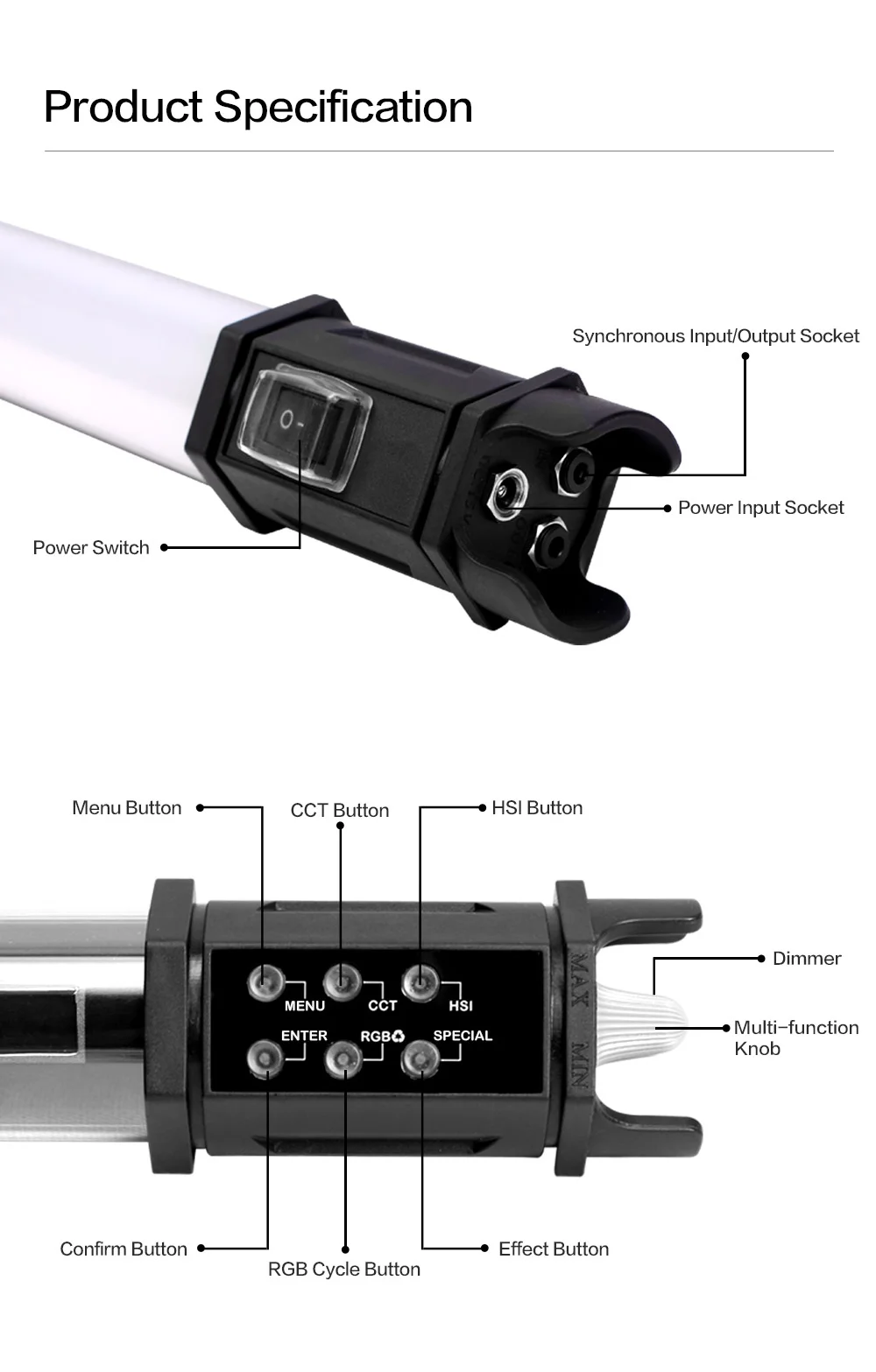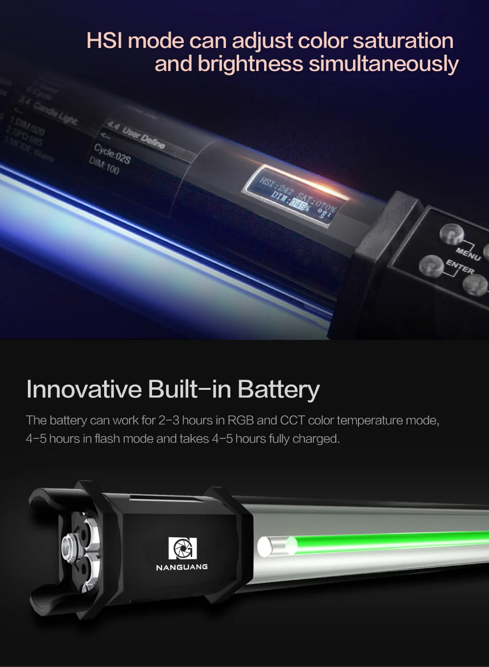 NanGuang 77 см/117 см светодиодный ламповый светильник RGB Цвет 2700K-6500K фотографии светильник ручной светильник палка ручной стабилизатор для фото видео фильм Vlog Особенности: 1. Широкий диапазон CCT(2700K - 6500K) Светодиодный светильник, широкий диапазон CCT от 2700K tungsten до 6500K в качестве ключа, заполняющий или ободной светильник для пленки, радиовещания или фотографии. 2.RGB + W (полный спектр) Это не только RGB, вы можете настроить насыщность цвета, чтобы реализовать полный спектр и выбрать почти любой цвет в видимом спектре. 3. Спецэффектов Вам не нужно будет носить дополнительные средства, чтобы улучшить видео с захватывающими кинематографическими эффектами. Трубчатые светильники имеют некоторые популярные спецэффектов, такие как шторм, свеча, вспышка, полиция и SOS. В то же время RGB cycle сделает ваши фотографии или видео более креативными и свободными. 4.Master-slave Поставляется со специальным контролем подчиненных, что обеспечивает вам еще один простой способ Соединяйте 10 осветительных приборов одновременно, легко использовать в студии и на месте. 5. Встроенный аккумулятор Встроенный аккумулятор может служить от 2-3 часов, свободно использовать светильник RGB в студии или на улице. 6. Несколько вариантов управления На ваш выбор есть Wi-Fi, 2,4G, управление через приложение и интерфейс для ручного меню. (беспроводное управление должно работать с коробкой для Wi-Fi в стиле «CN-W2») Пожалуйста, имейте в виду: 2,4g, приложение Wi-Fi управление нуждается в работе с CN-W2 Wi-Fi контроллер коробки Нажмите здесь, чтобы купить коробку с контроллером Wi-Fi в стиле «CN-W2»