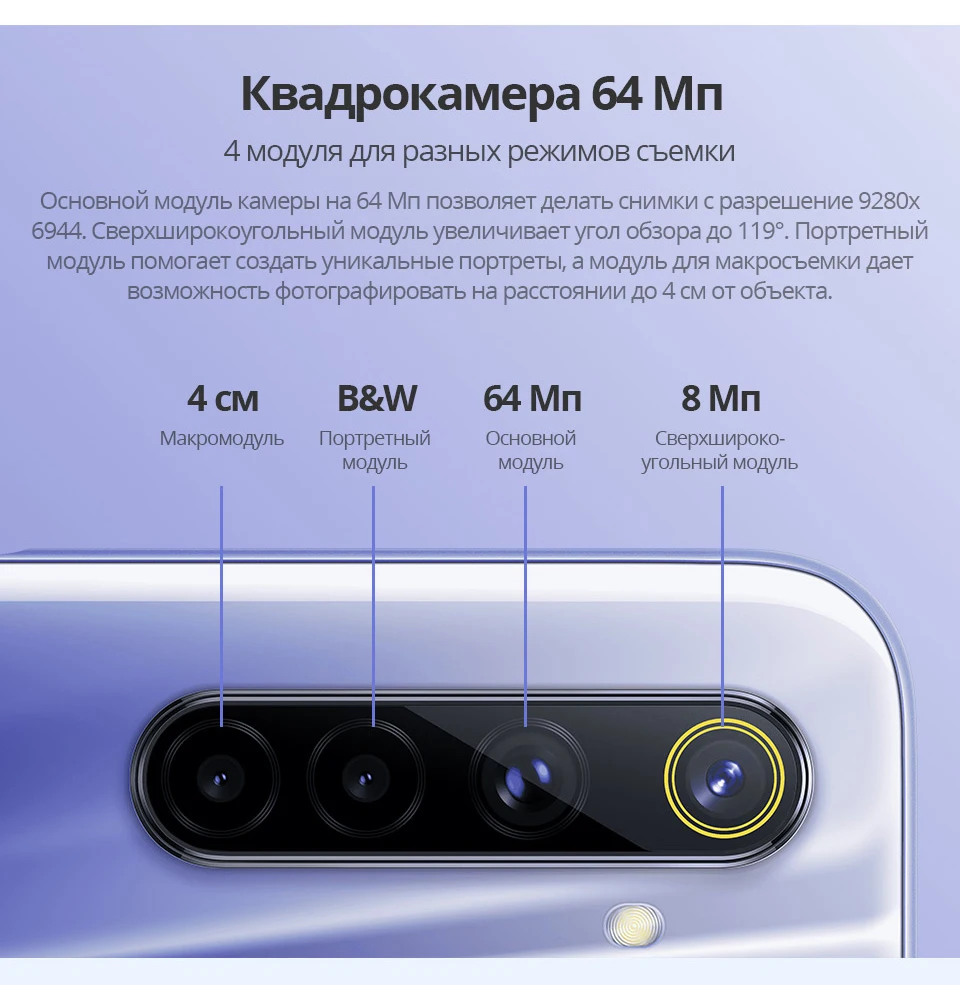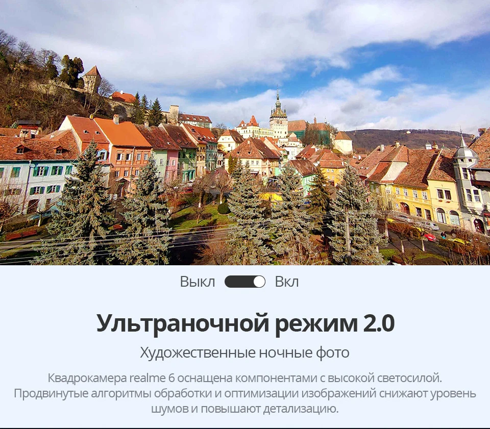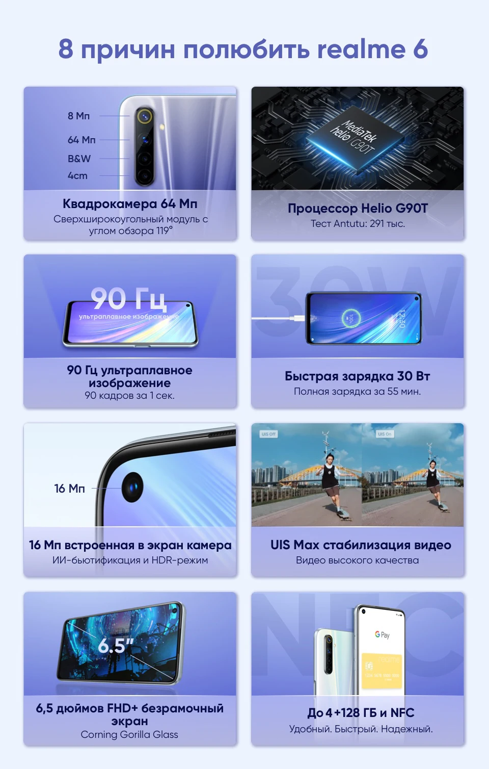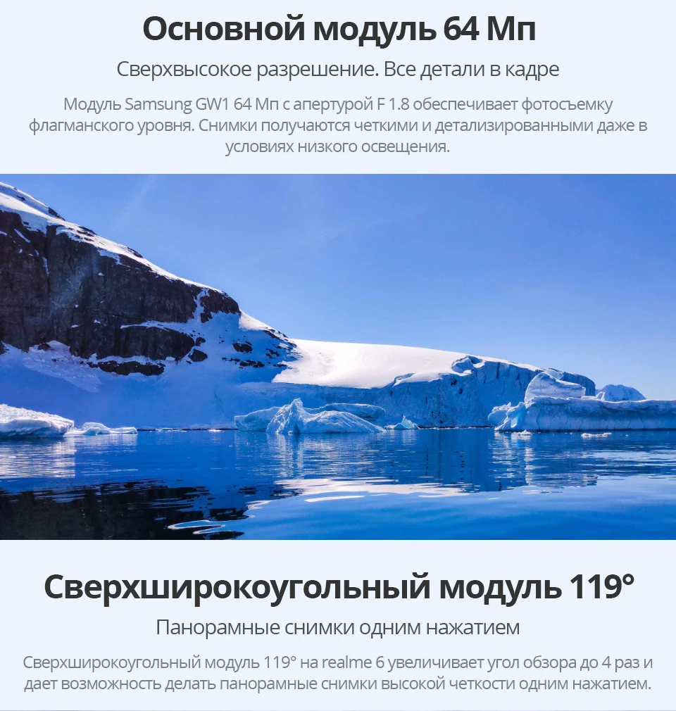 Примечания: 1. Обзор сверхширокоугольного модуля составляет 119°, согласно информации производителя. См фактический продукт. Обзор в 4 раза шире по сравнению со стандартным широкоугольным модулем. 2. 4 ГБ + 128 ГБ — максимальная конфигурация realme 6. 3. Данные о полной зарядке за 1 час получены во время лабораторных тестов realme. См. фактический продукт. 4. Данные о разблокировке смартфона за 0,29 секунды с помощью бокового сканера отпечатков пальцев получены во время лабораторных тестов realme. См. фактический продукт. 5. Данные о полезной площади экрана получены во время лабораторных тестов realme. 6. Стабилизация видео UIS Max, Slo-mo селфи и SOLOOP станут доступны вместе с обновлением ПО. 7. Количественные данные производительности CPU и GPU получены в результате теста Antutu V8.2.4. 8. Данные об увеличении производительности в режиме Hyper Boost получены в результате тестов лаборатории realme. См. фактический продукт. 9. Сравнительные данные разных типов зарядки получены в лабораторных тестах realme и могут в реальности отличаться в зависимости от конкретных условий. 10. Бренд смартфонов №1 по качеству по результатам опроса Mobile Industry Consumer Insights Survey, проведенного в сентябре 2019 г.