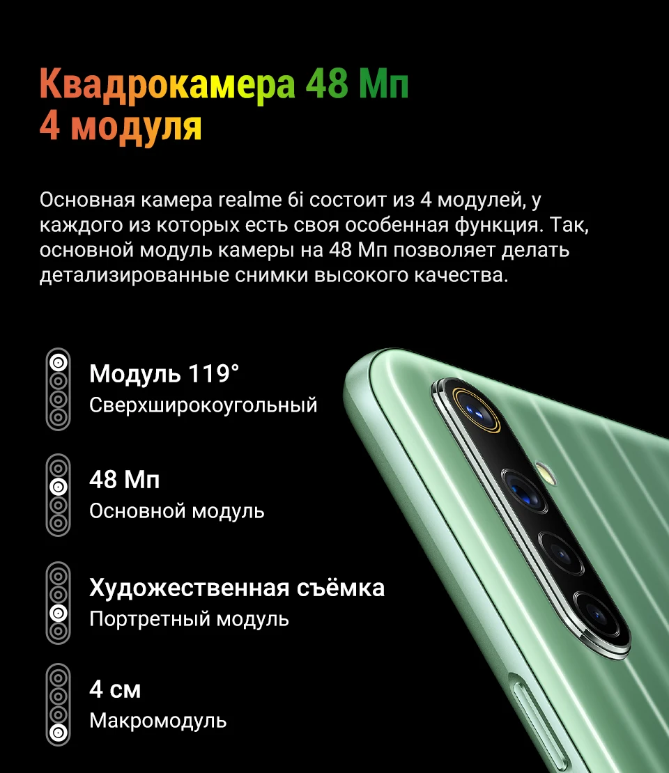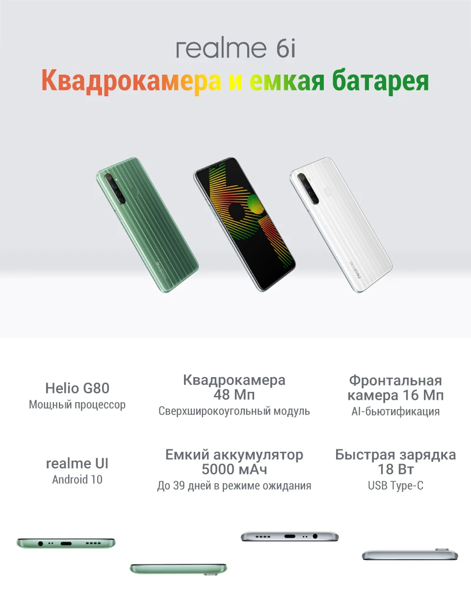 Примечания: 1. Данные о процессоре основаны на информации с официального сайта MidiaTek. Под предыдущим поколением имеется в виду realme 5i. 2. Данные об угле обзора получены из лабораторных тестов realme. См. фактический продукт. 3. Данные о работе аккумулятора получены из лабораторных тестов realme. См. фактический продукт. 4. Данные о полезной площади экрана получены из лабораторных тестов realme. См. фактический продукт. 5. Стандарты тестов получены из лаборатории realme.