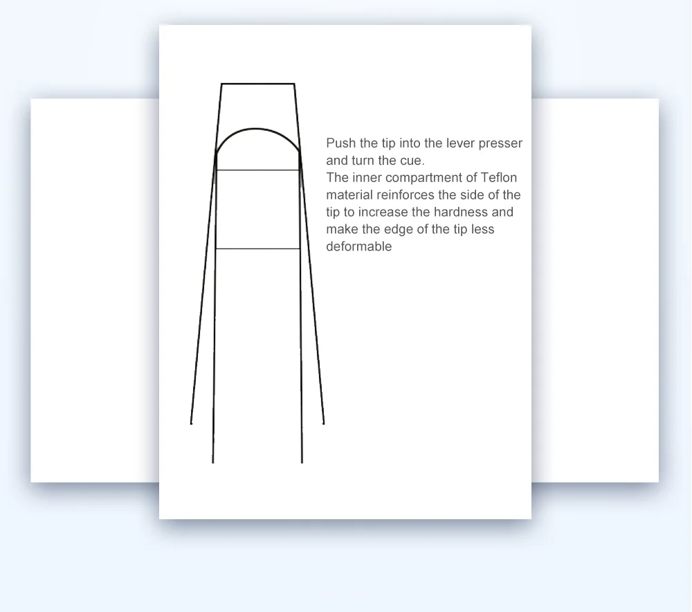 Простой и быстрый инструмент Нажатие на КРАЙ наконечника Внутренний склад тефлонового материала Гладкая, не повреждая кончик Вставьте наконечник в рычаг прижима и поверните кий. Внутренний отсек тефлонового материала усиливает боковую часть наконечника для увеличения твердости и Сделайте КРАЙ наконечника менее деформируемым Высокая производительность Иглоукалывание Матовый Иглоукалывание наконечника Легче расширить зазоры в наконечнике Полированная дуга наконечника Когда дуги недостаточно, вы можете отполировать матовый Поверхность с cue tipat 45 градусов, И полировать его несколько раз, чтобы показать Дуга, которую вы хотите