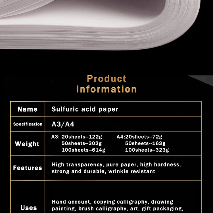 Прозрачная бумага серной кислоты | Хорошая бумага, хорошее изображение, создает различную красоту | Бумага жесткая и легкая в создании Особенности: высокая прозрачность, чистая бумага, высокая твердость, прочность и долговечность, устойчивость к морщинкам Использование: ручная работа, копирование каллиграфии, рисование, кисть каллиграфии, искусство, подарочная упаковка, архитектура, пейзаж художника, и т. Д. Высокая прозрачность | Четкие и четкие | Тренировка красивых персонажей Тонкий и Непрозрачный | Достаточно жесткий | Гладкий | Не легко проникает Прозрачный и тонкий | Не легко сломать | Пишите гладко | Без когтеточки