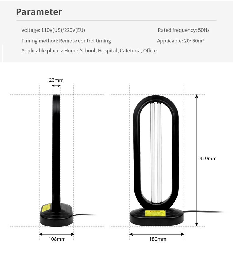 Тип: бактерицидная настольная лампа UVC Цвет излучения: голубовато-фиолетовый Длина волны: 260 нм Материал: кварцевая трубка Напряжение: 110 В/220 В Вилка: вилка США/ЕС Мощность: 50 Вт Время: пульт дистанционного управления Область дезинфекции: <= 60 м ² Предполагаемый период: 1-3 раза в неделю Предполагаемое время стерилизации: 30-60 минут один раз