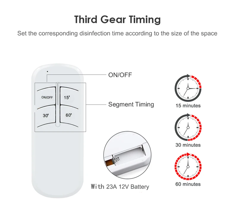 UVC Ray вреден для глаз и кожи, не смотрите на лампу, когда светильник поднимается. Люди/питомцы/растения не могут подвергать светильник. После использования, потому что лампа убивала много бактерий в комнате, пожалуйста, откройте окна и двери, позвольте комнате проветривать 15 минут, а затем войти.