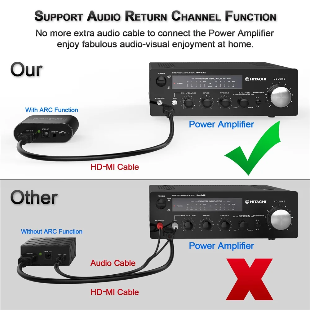 1) чтобы использовать HD-MI ARC (Канал возврата аудио), вы должны поддерживать HD-MI ARC 2) при переключении на 5.1CH аудиосистема, подключенная к порту 5.1CH, должна иметь декодирование. В противном случае, когда источник DTS/DOLBY-AC3, звук не будет 3) Этот HD-MI аудио конвертер может поддерживать только HDCP 1,4 выход 4) этот порт питания аудио extracor поставляется с портом micro usb или DC, мы отправим его случайным образом 5) функция ARC применима только к порту toslink.