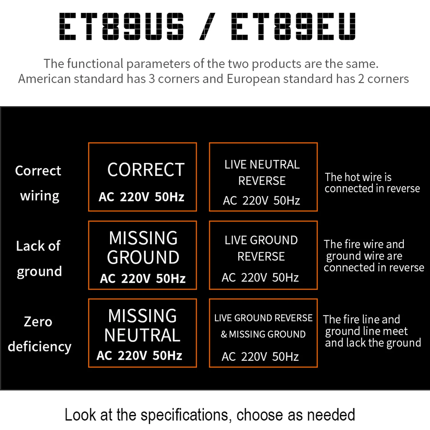 Функция обнаружения отображает как напряжение, так и частоту: правильный, недостающий земли, недостающий нейтральный, живой нейтральный обратный, живой Заземленный обратный, живой Заземленный обратный и недостающий Заземленный