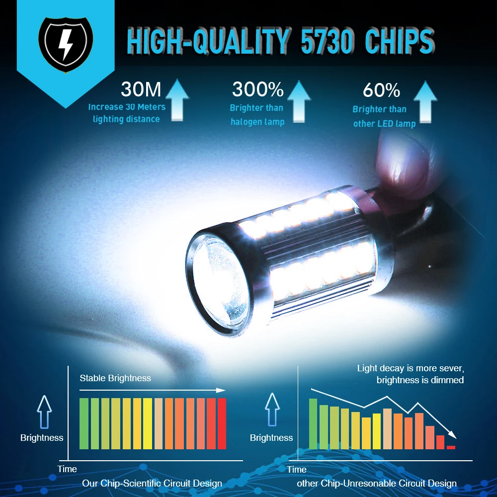 Наш светодиодный светильник в 3 раза ярче, чем оригинальные автомобильные галогенные лампы, на 60% ярче, чем нормальный светодиодный фонарь, и имеет радиус действия более 30 метров.