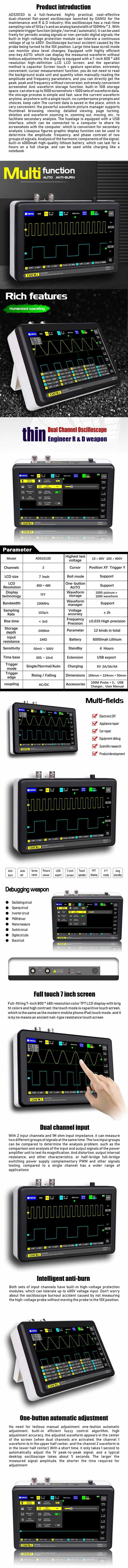 ADS1013D-полнофункциональный, очень практичный, экономичный двухканальный плоский осциллограф, запущенный DANIU для обслуживания и R & D промышленности; этот осциллограф имеет частоту дискретизации в реальном времени 1GSa / s и аналоговую пропускную способность 100 МГц * 2. С полной функцией триггера (одиночный/Нормальный/автоматический), Он может быть использован свободно для периодического аналогового сигнала или непериодического цифрового сигнала; Встроенный модуль защиты высокого напряжения может переносить Непрерывное напряжение до 400 В. ДТП осциллографа, вызванный поворотом зонда в положение 10X. Режим Прокрутки с большой базой времени может контролировать изменения медленного уровня; Оснащен высокоэффективным одним ключом, который может отображать измеренную форму волны без утомительных настроек; дисплей оснащен 7-дюймовым ЖК-экраном высокой четкости с разрешением 800*480, а способ работы-конденсаторный сенсорный экран + управление жестами, чрезвычайно удобный; Функция измерения курсора, вам не нужно считывать круглую шкалу и количество при ручном считывании параметров амплитуды и частоты, и вы можете напрямую получить и частоту без преобразования; чрезвычайно удобный скриншот и функция хранения сигналов, встроенный объем памяти 1 Гб, Может хранить до 1000 скриншотов + 1000 наборов данных волноводной формы, процесс хранения прост и быстр, сохраняет текущее состояние в любое время, в любом месте одним касанием, без громоздких подсказок и выбора, сохраняйте спокойствие, сохраняя текущие данные в месте, которое очень удобно; Мощный Графический менеджер поддерживает просмотр, просмотр, Детальный просмотр, поворот страницы, удаление и масштабирование формы волны, масштабирование, перемещение и т. Д., чтобы облегчить вторичный анализ. Фюзеляж оснащен интерфейсом USB, который может быть подключен к компьютеру, чтобы поделиться своими скриншотами с компьютером, что удобно для вторичного анализа; функция графического дисплея Lissajous может использоваться для определения амплитуды, частоты и фазового контраста двух групп сигналов; Анализ гармонических компонентов сигнала; Встроенный литий-ионный аккумулятор высокого качества 6000 мАч, который может работать в течение 4 часов при полной зарядке и может использоваться во время зарядки, как ноутбук