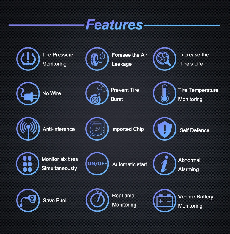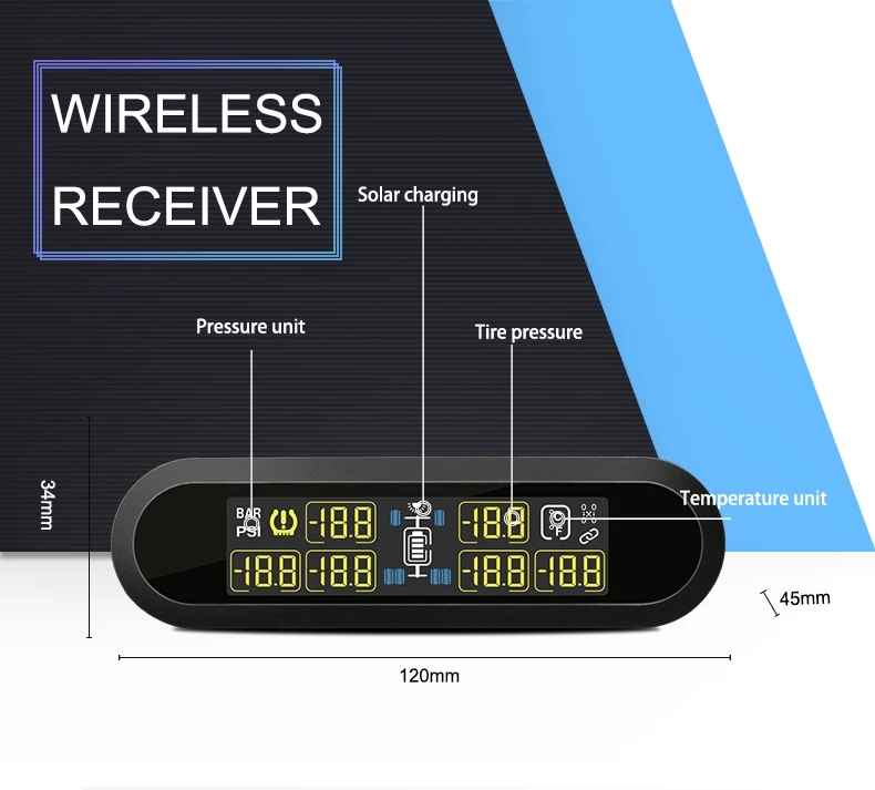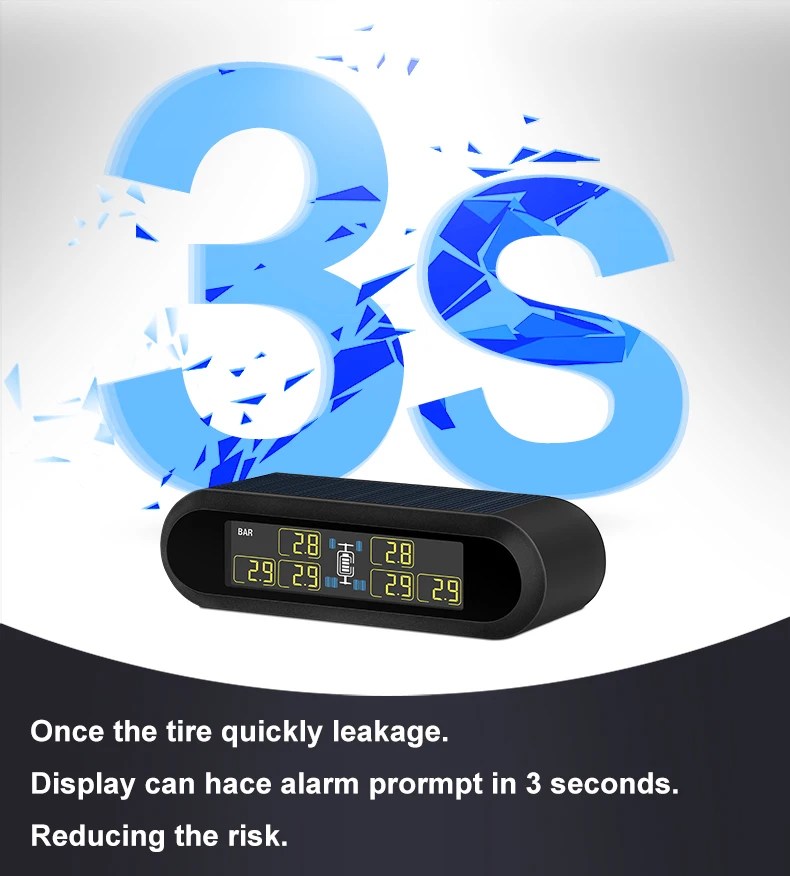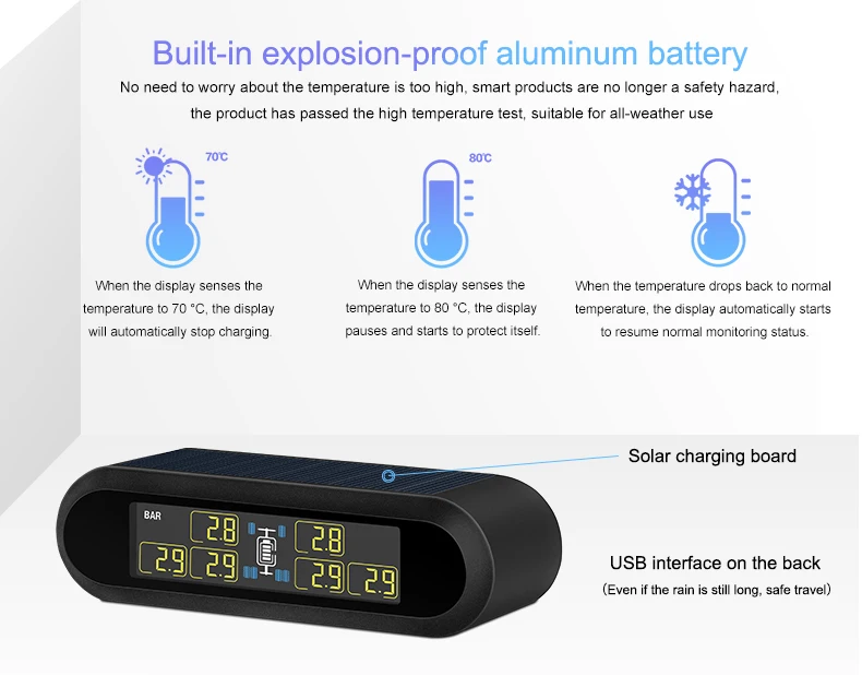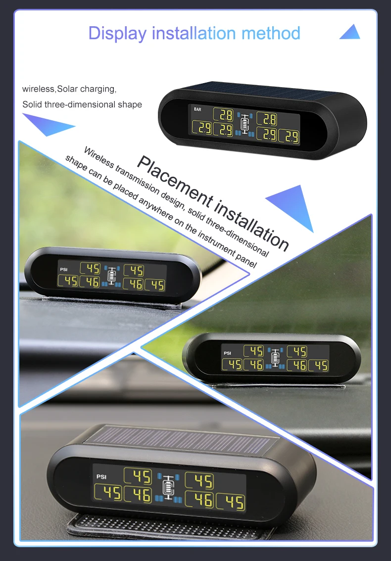 01. TPMS USB линия зарядки, встроенный литиевый аккумулятор солнечной панели, чтобы помочь зарядить, чтобы продлить время работы дисплея, 6 * Сменный внешний датчик батареи, может быть переключен на 4 * Датчик во время использования.